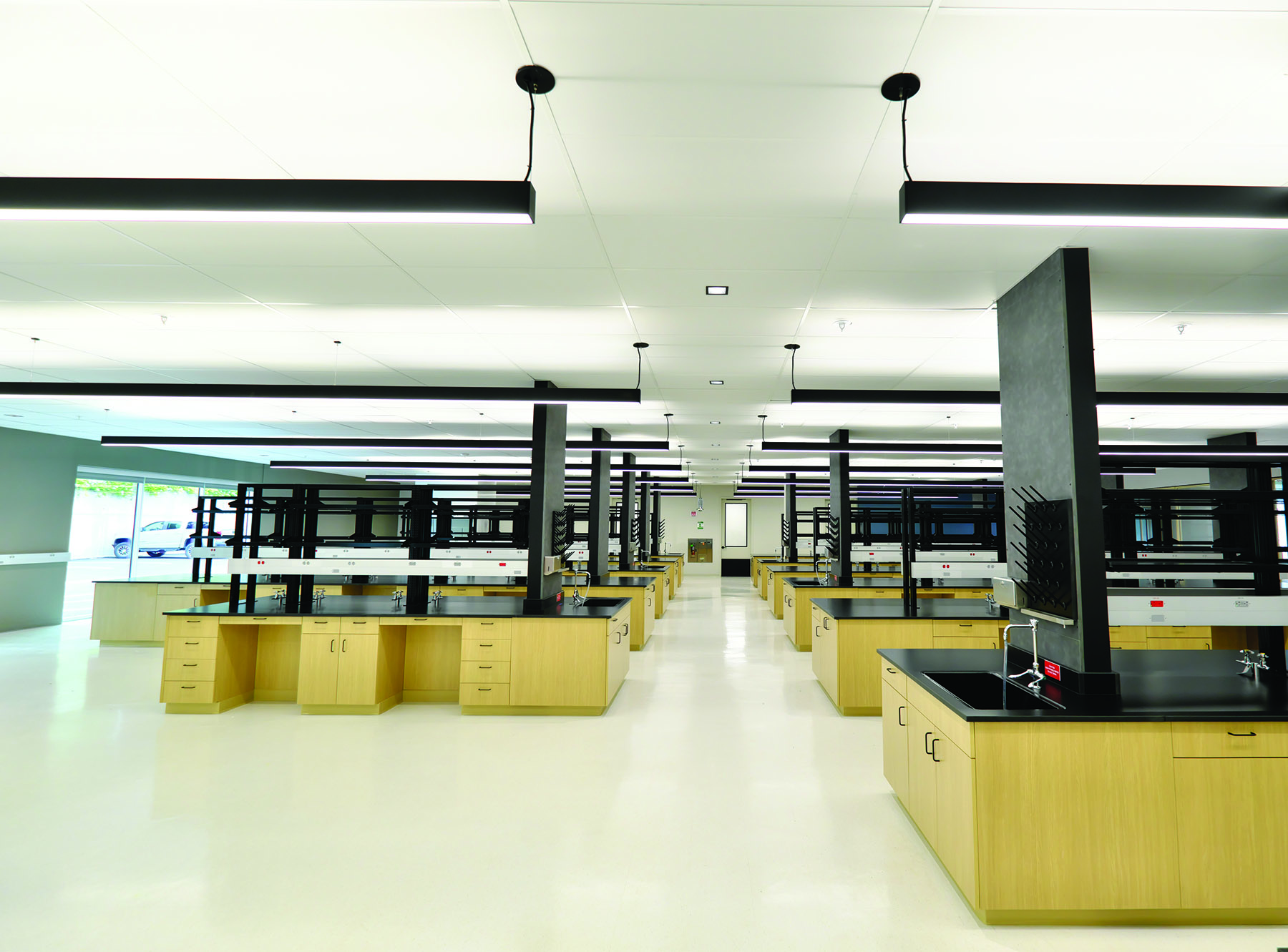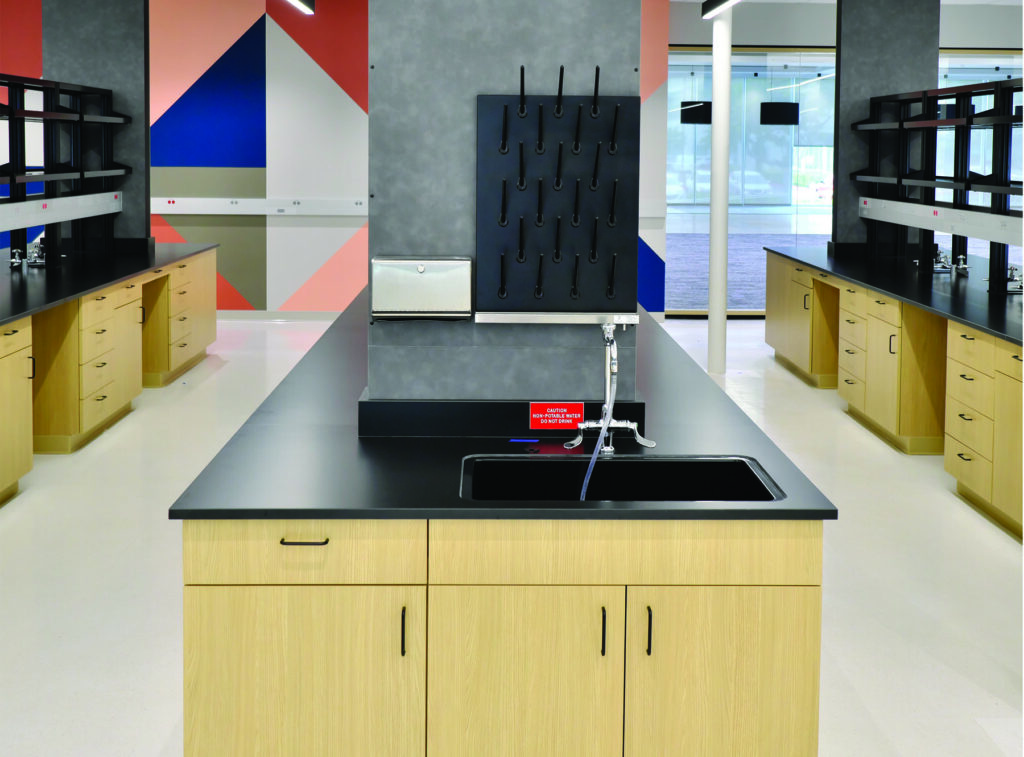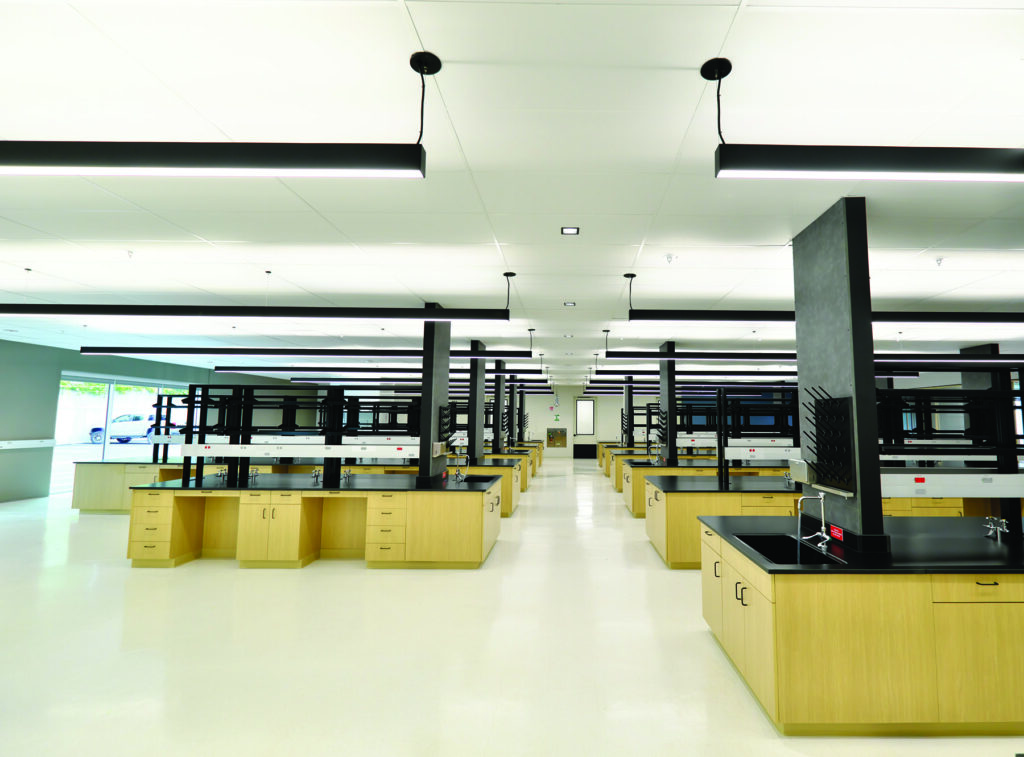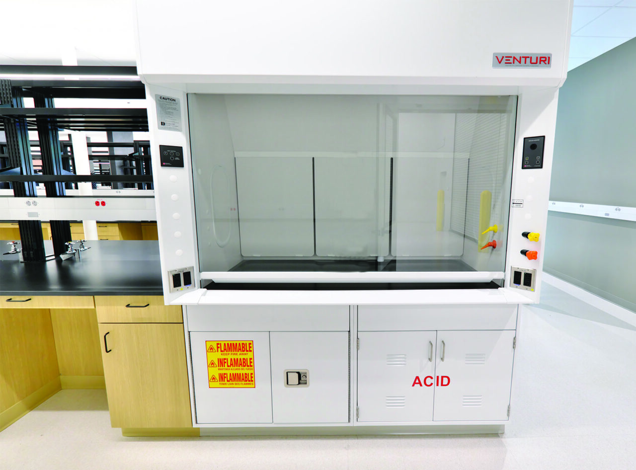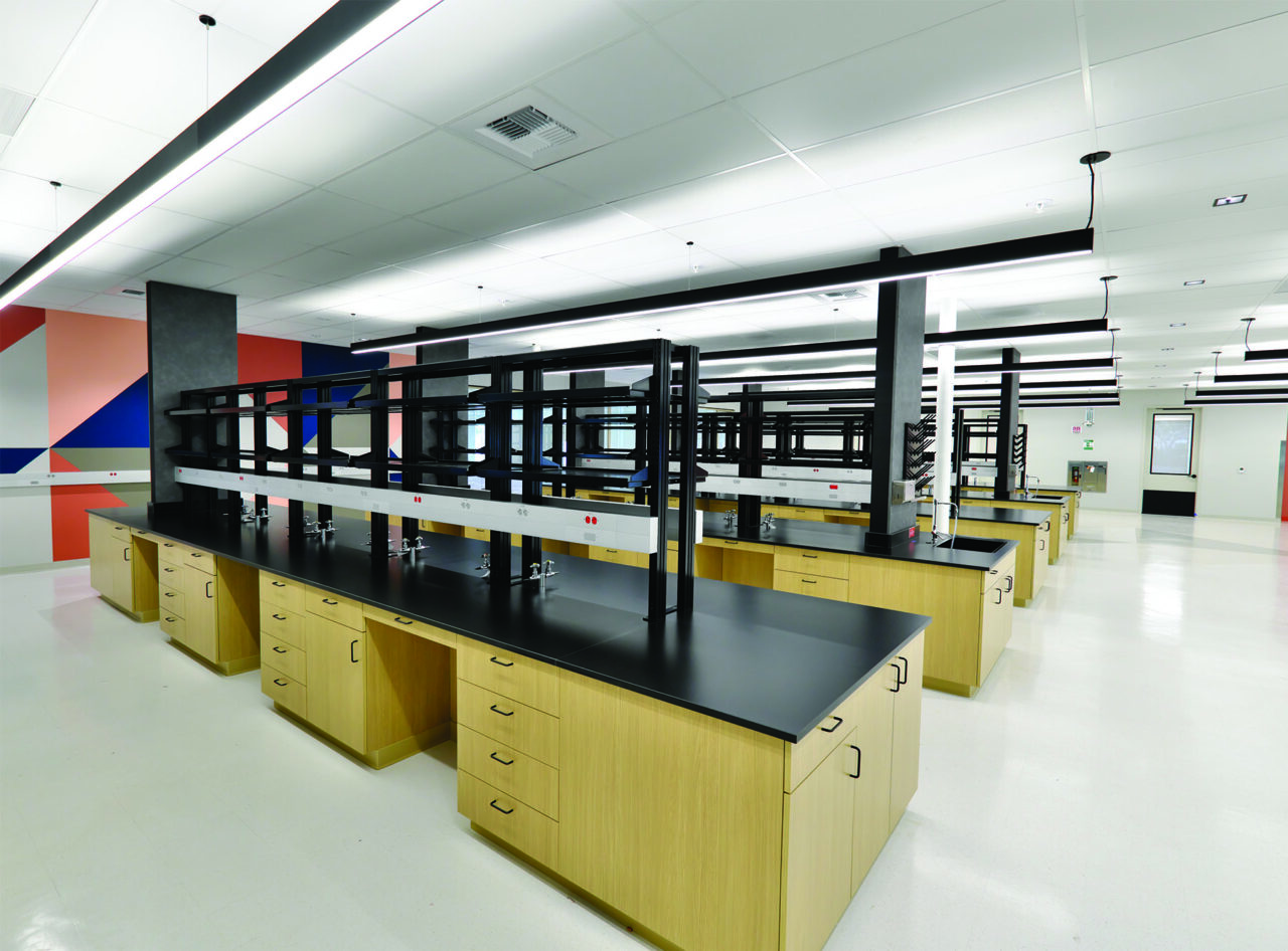 This laboratory provides a versatile design for various scientific disciplines and research objectives. ISEC’s scope of work included: Kewaunee Scientific Laboratory fume hoods, “Alpha” shelving assemblies, plastic laminate casework, umbilicals, and phenolic resin countertops.