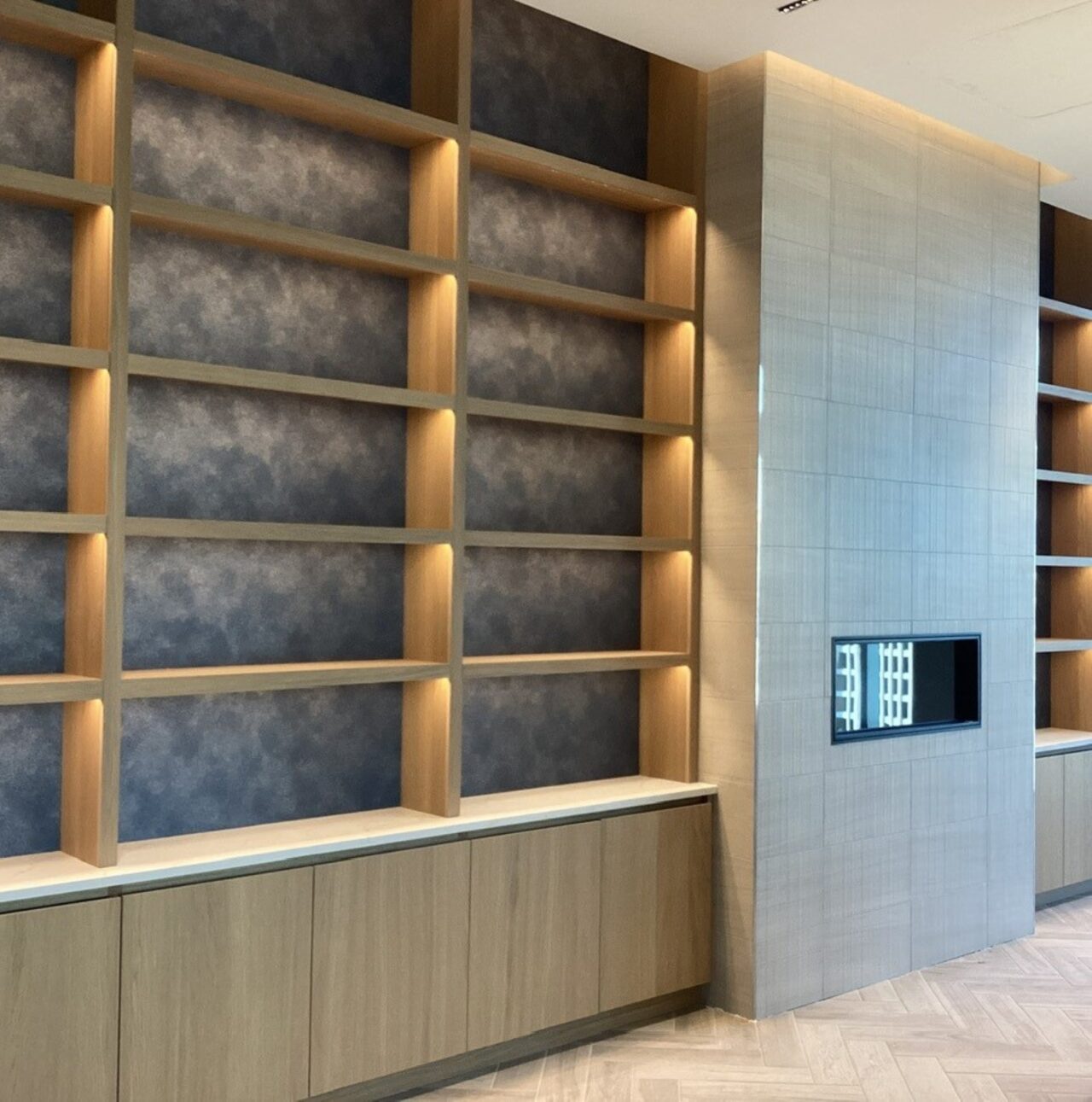 Amenity spaces on Level 34 feature custom shelving, a fireplace, and quartz-clad elements—large slabs were hoisted months in advance using the temporary exterior elevator, as they exceeded the size limits of the building’s service elevator. This proactive coordination allowed us to maximize slab size, minimize visible seams, and achieve a whole, monolithic look.