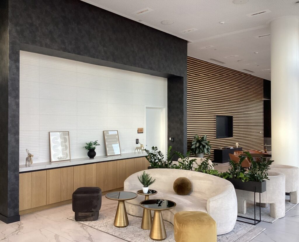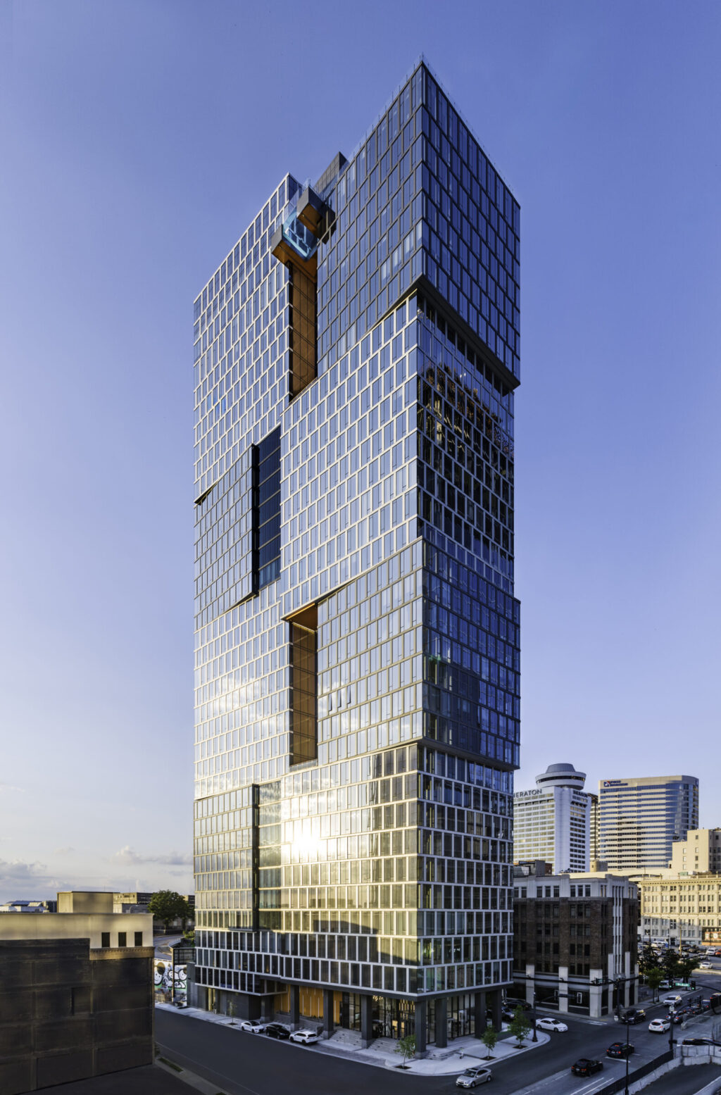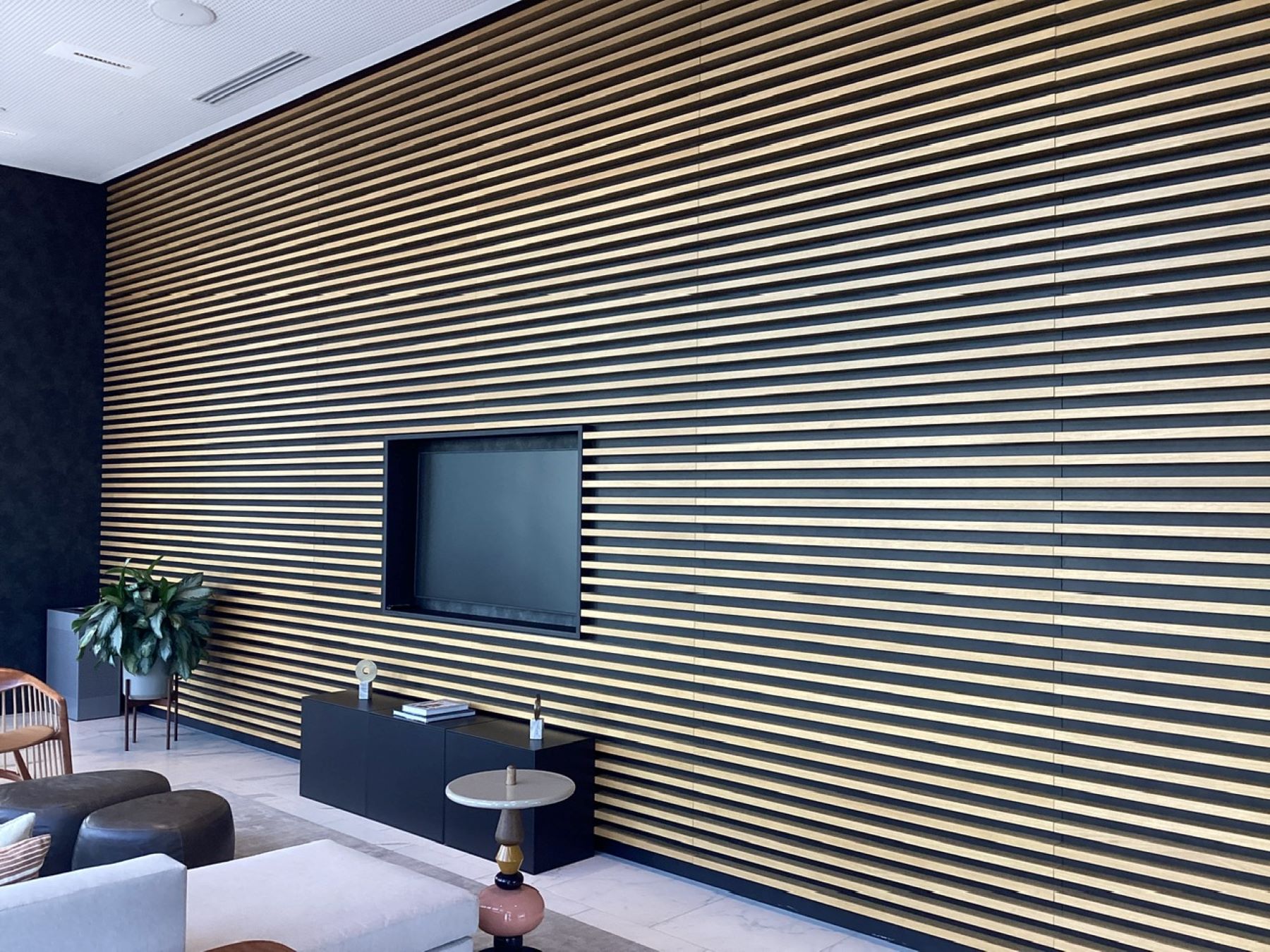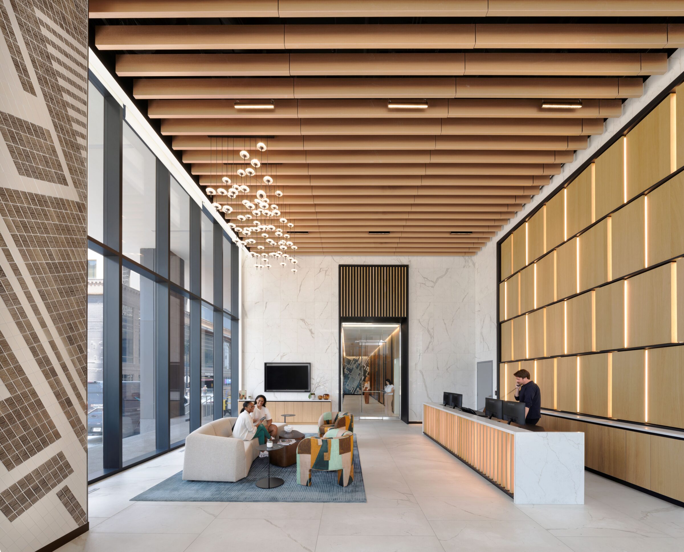 ISEC’s work on a 34-story apartment tower in downtown Nashville highlights the power of early planning and prefabrication. From the flowing 18-foot wood feature wall and custom reception desk in the lobby to elevator lobbies throughout, ISEC blended craftsmanship with coordination to deliver high-end finishes on schedule. By standardizing and prefabricating wood and slat wall panels, we minimized onsite work and accelerated installation.