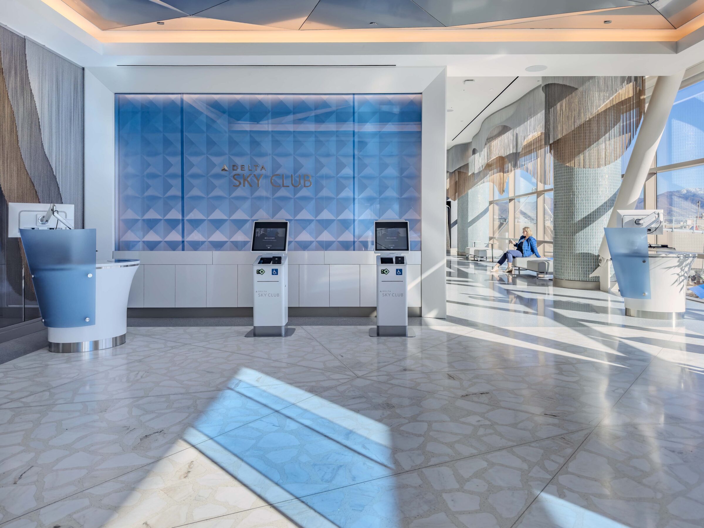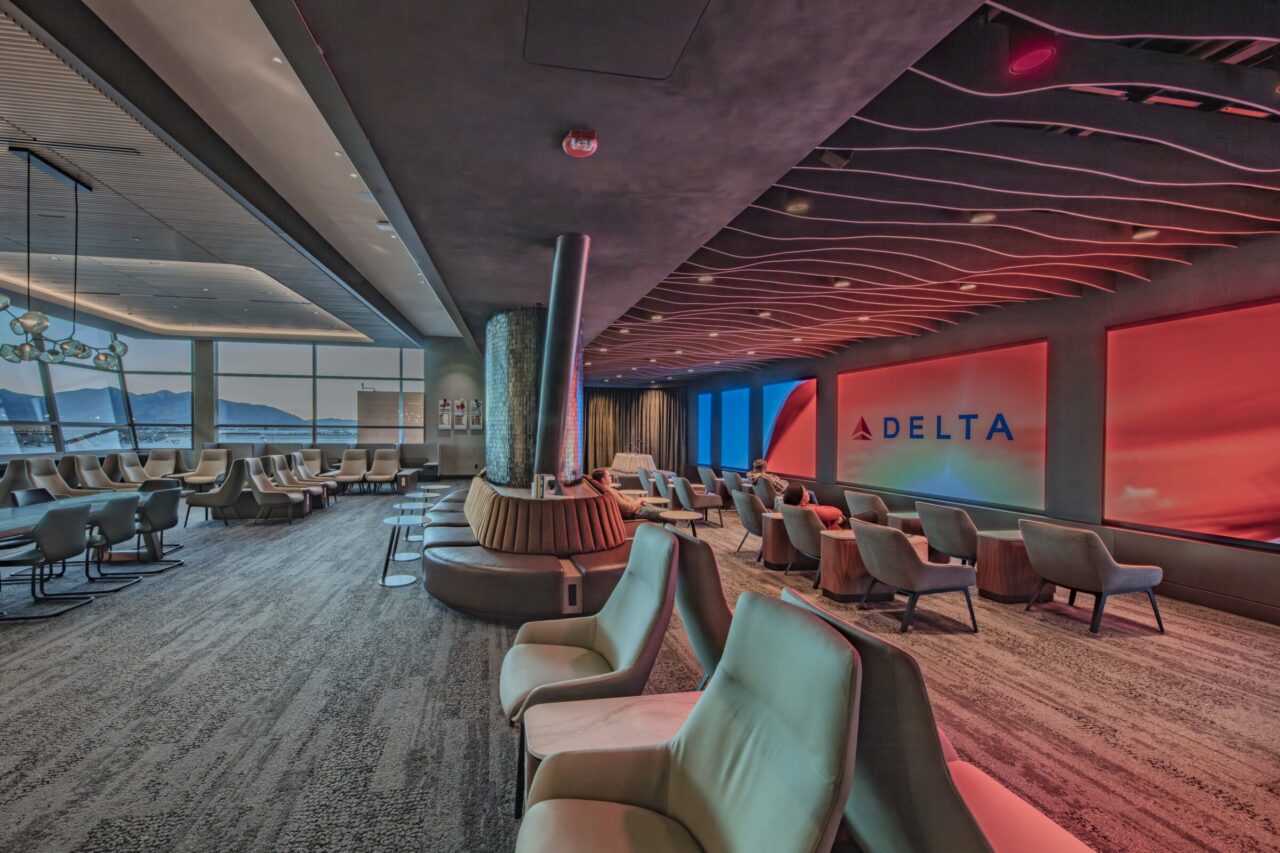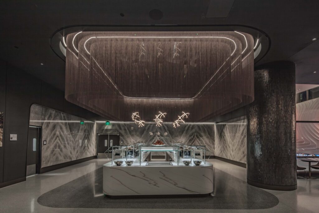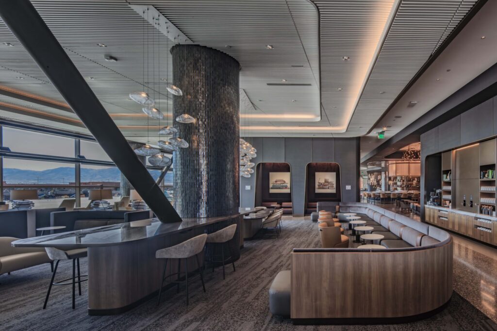 ISEC provided design-assist, fabrication, and installation for the Delta Sky Club at Salt Lake City International Airport, supporting architect-led design with precision and quality craftsmanship. Scope included custom millwork, quartz and stone features, walnut paneling, and decorative ceiling elements. ISEC fabricated and installed banquette seating, natural stone workstations, service stations with metal casework, and a solid-surface buffet.