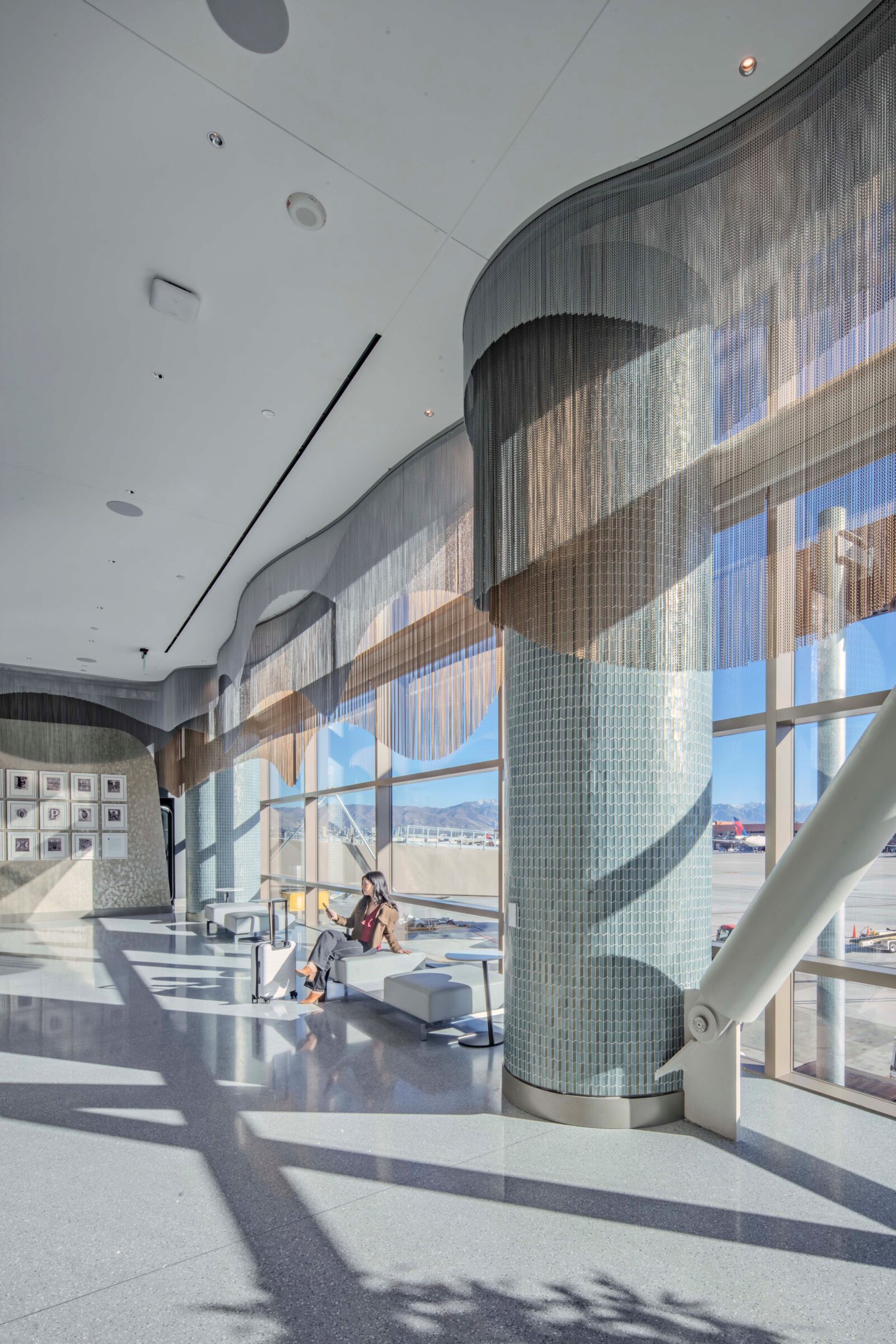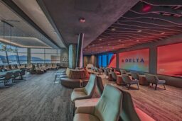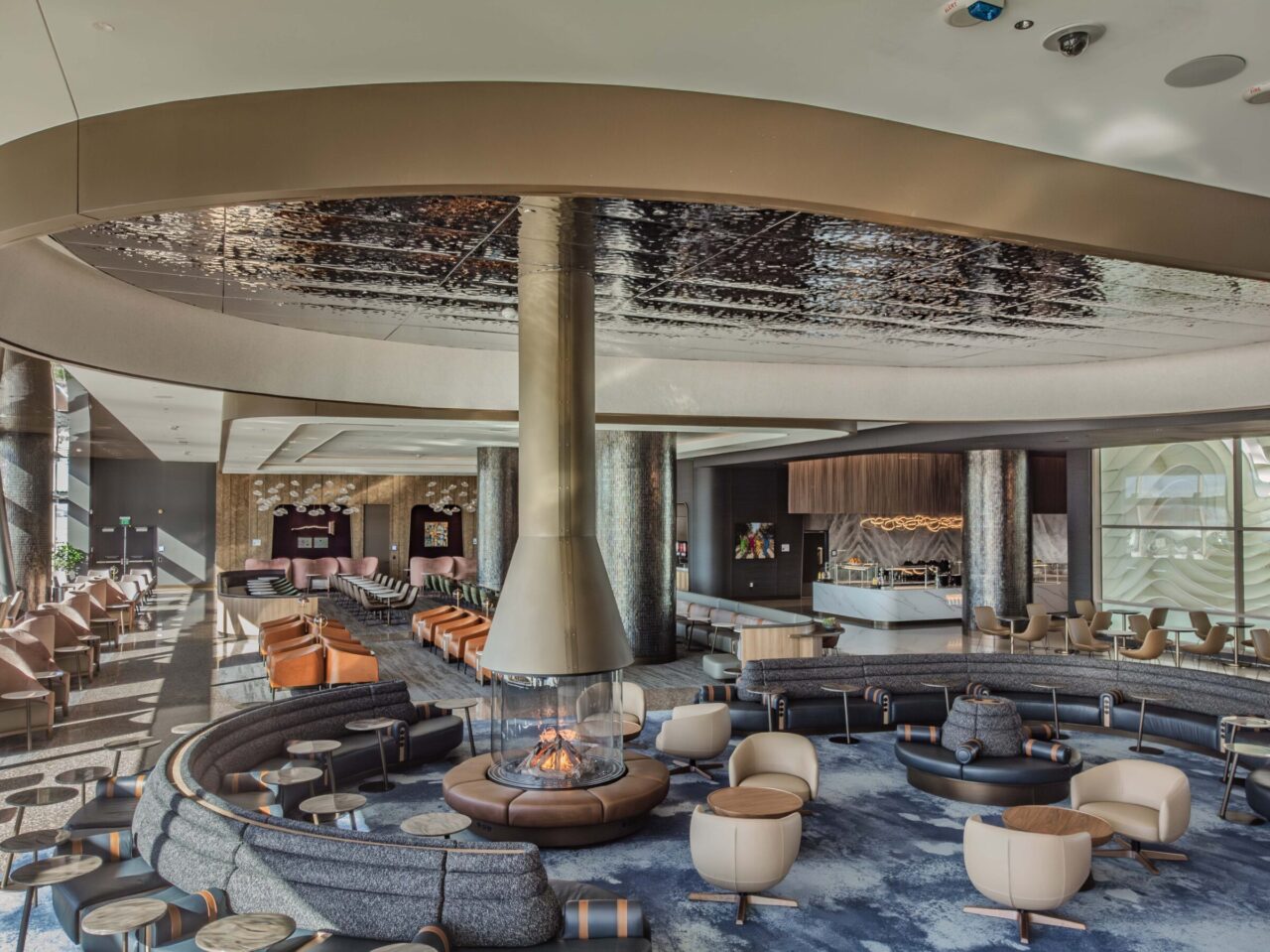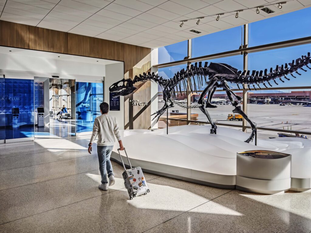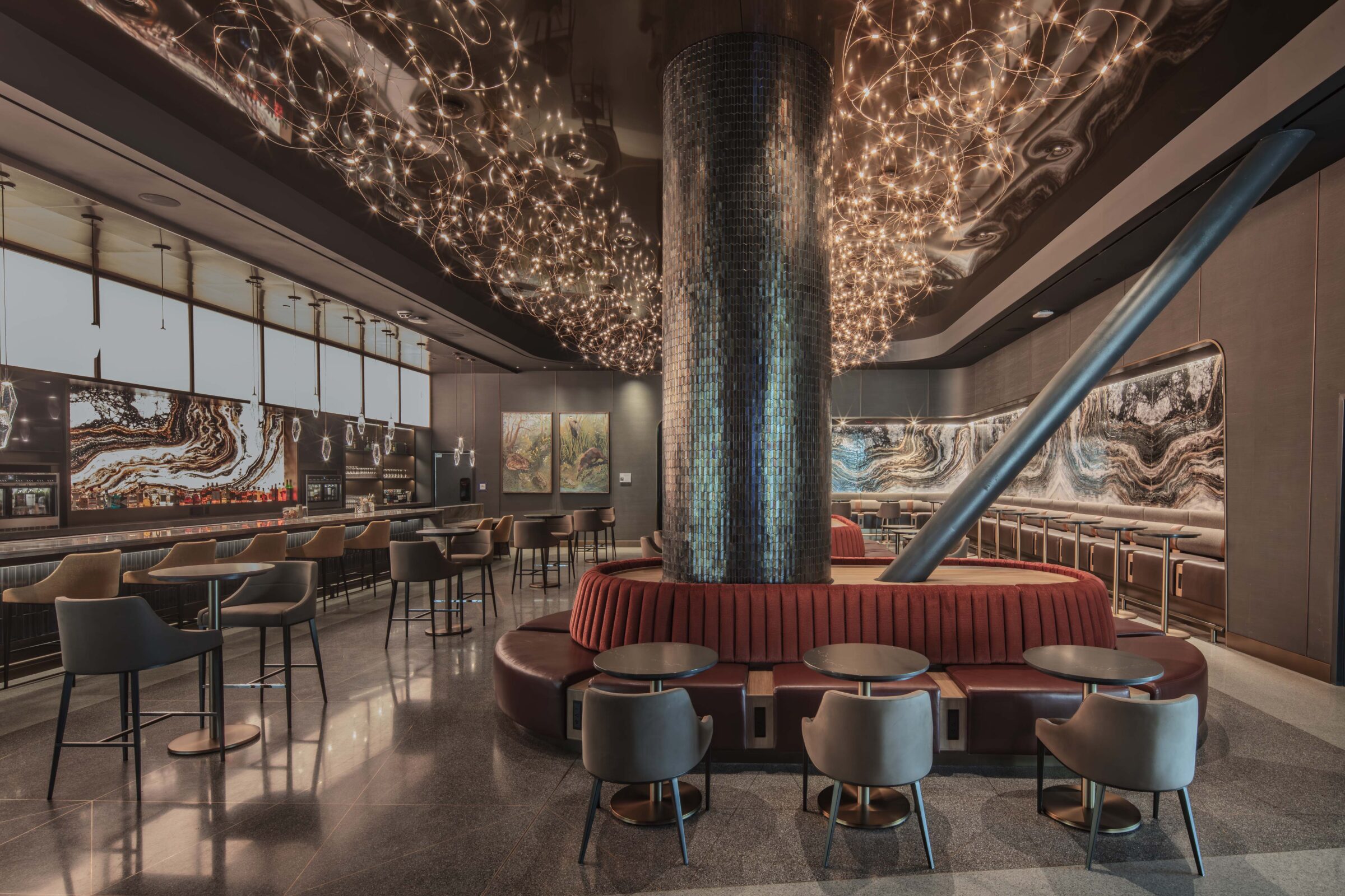 ISEC provided design-assist, fabrication, and installation for the Delta Sky Club at Salt Lake City International Airport, supporting architect-led design with precision and quality craftsmanship. Scope included custom millwork, quartz and stone features, walnut paneling, and decorative ceiling elements. ISEC fabricated and installed banquette seating, natural stone workstations, service stations with metal casework, and a solid-surface buffet.