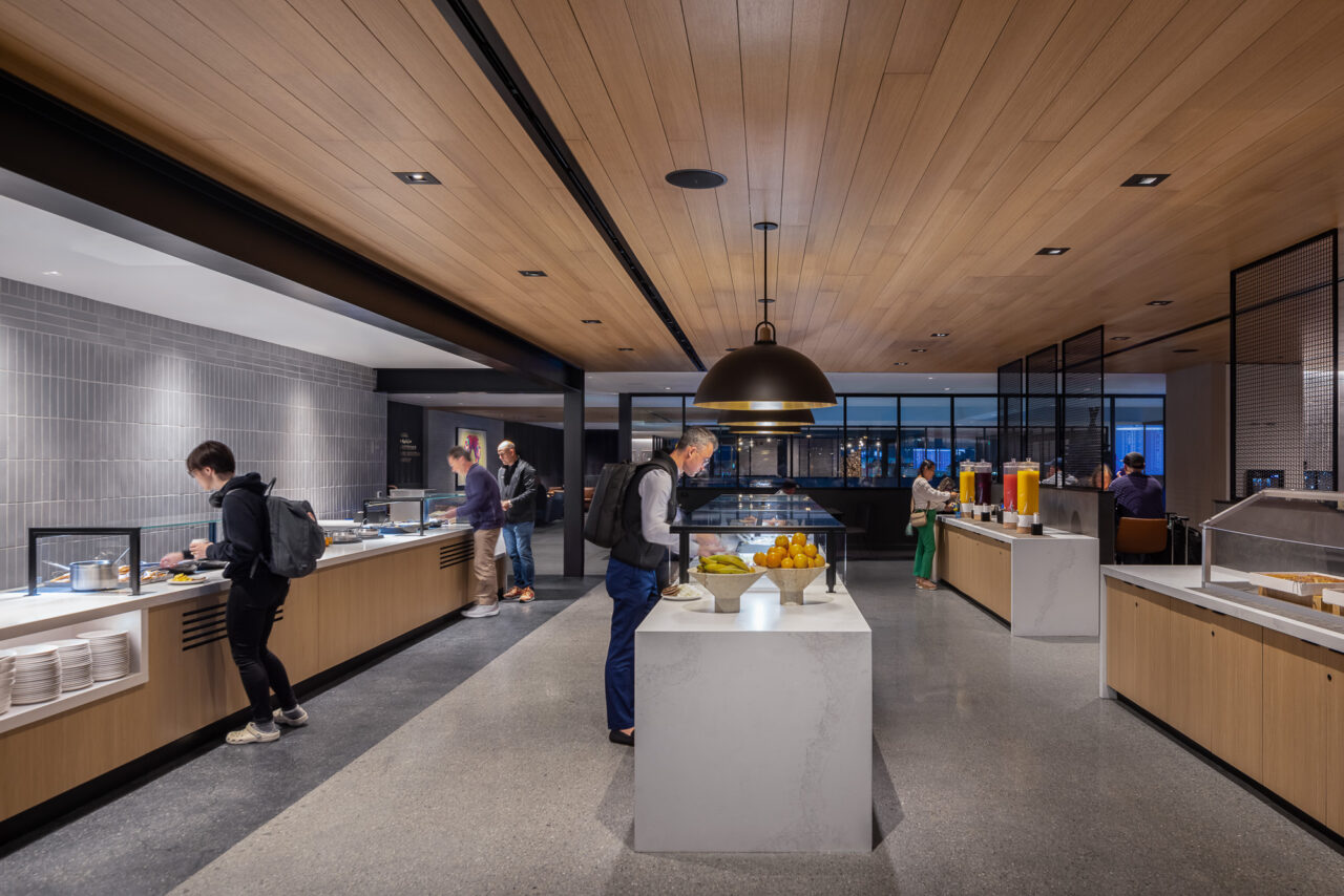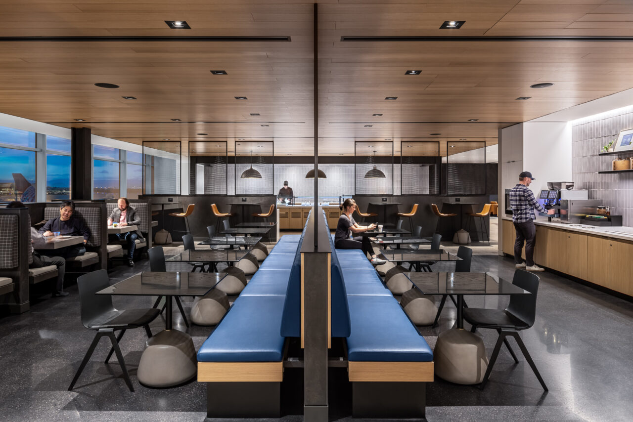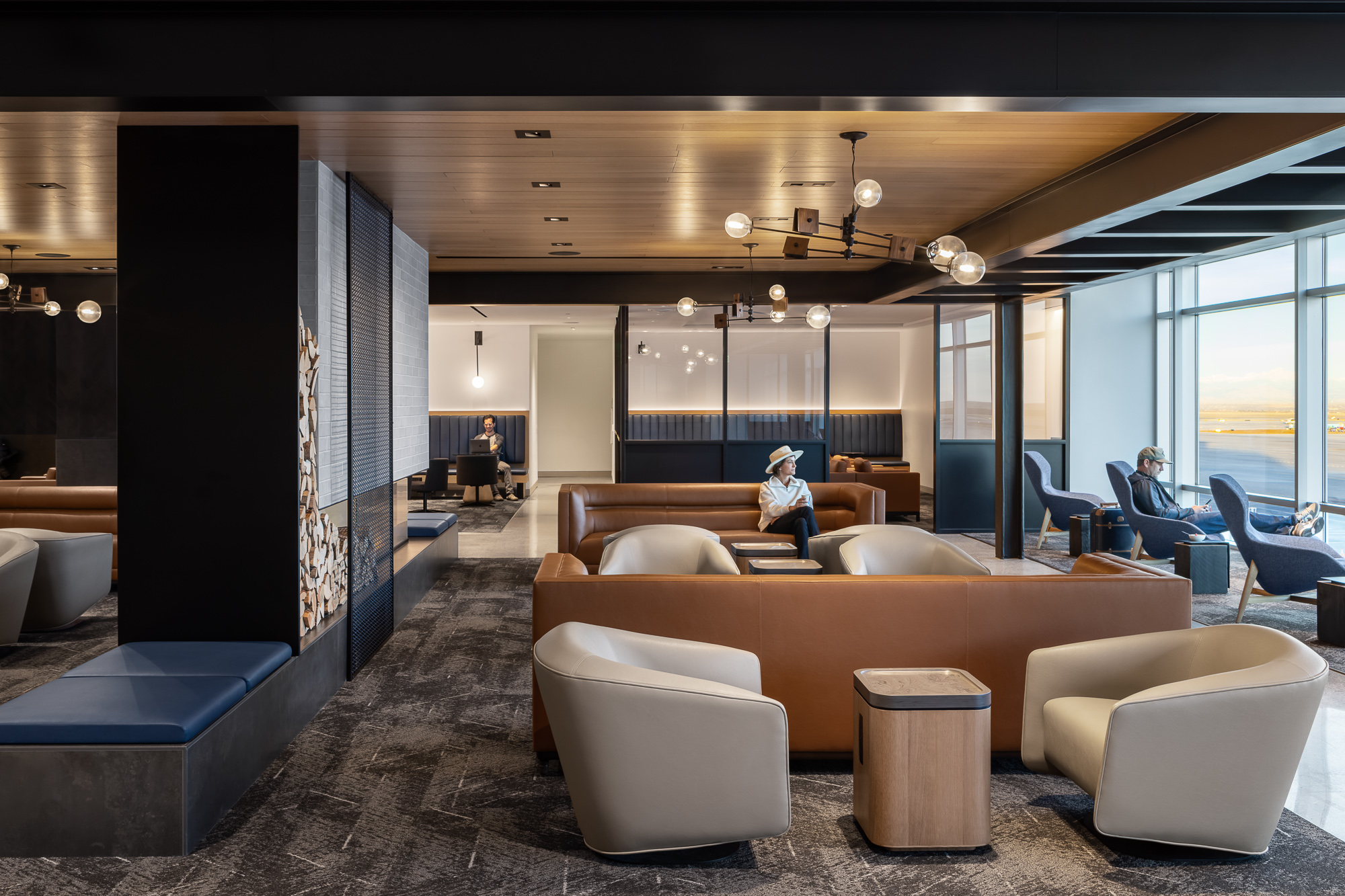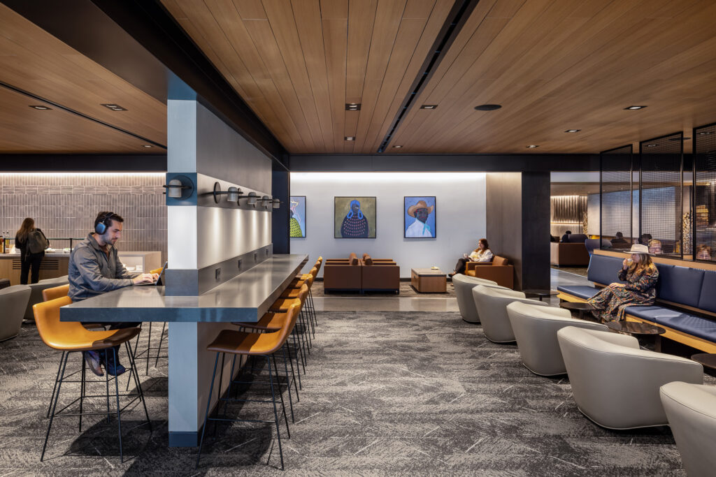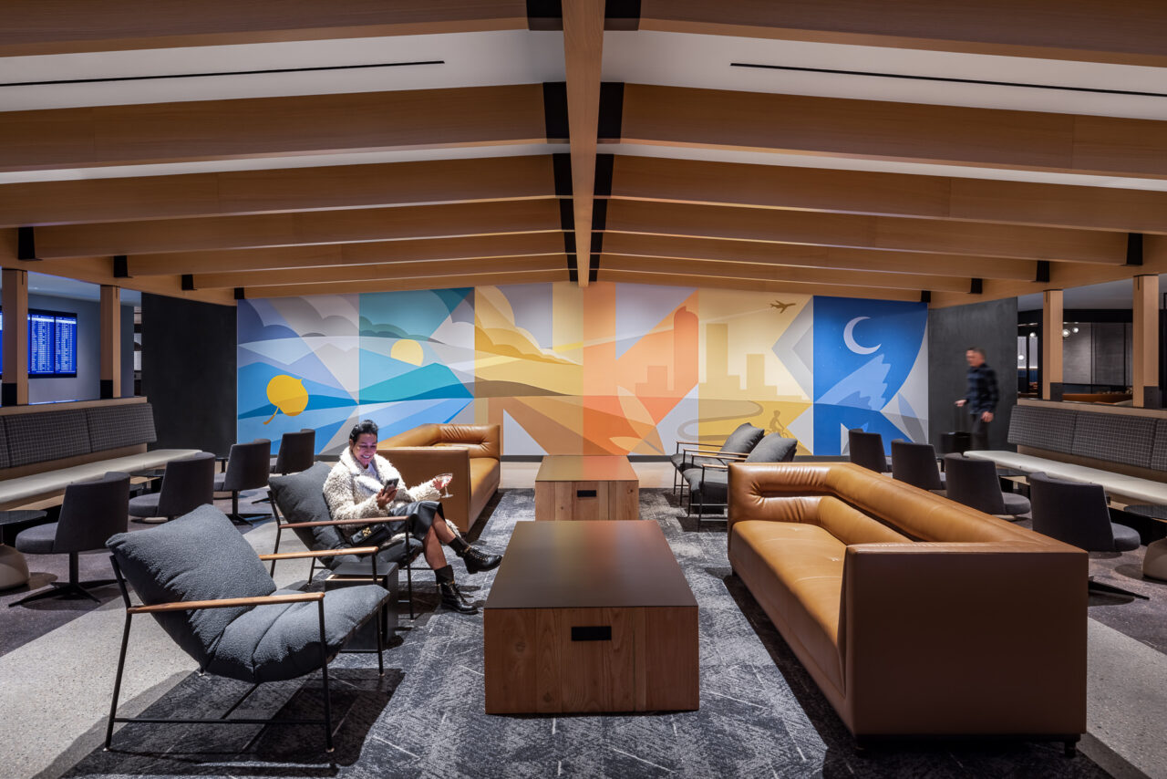 The United Club Lounge, located in Concourse B at DEN, the largest in the world, offers luxury and comfortability. The space reflects Denver culture, from the Colorado-inspired mural to the log fireplace. Members can enjoy a workspace, lounge space, dining space, and a fully stocked bar.