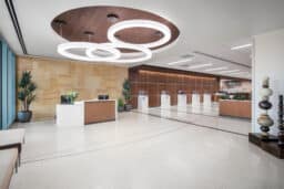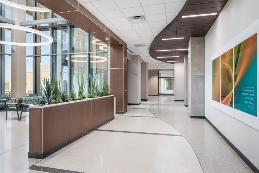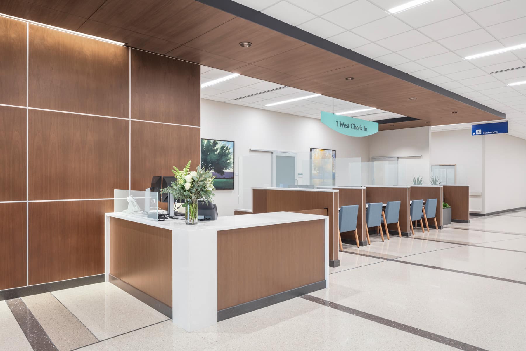 In addition to the new patient tower, approximately 20,000 sq. ft. of tenant improvement work will be completed to increase capacity at the existing hospital, including check-in and waiting rooms, conference, office and work rooms, storage on the first three floors and connection into the existing tower on the second and third floors. ISEC’s scope of works include: rough carpentry, interior architectural woodwork, slatwall paneling, simulated stone fabrications, joint sealants, hollow metal doors and frames, prefinished flush wood doors, access doors & frames, barn doors, door hardware, glazing, unframed mirror glazing, between glass blinds, fabric wrapped panels, miscellaneous specialties, visual display boards, toilet compartments, cubicle specialties, wall and corner guards, toilet accessories, metal lockers, healthcare casework, simulated stone countertops, bullet resistant partitions, and equipment.