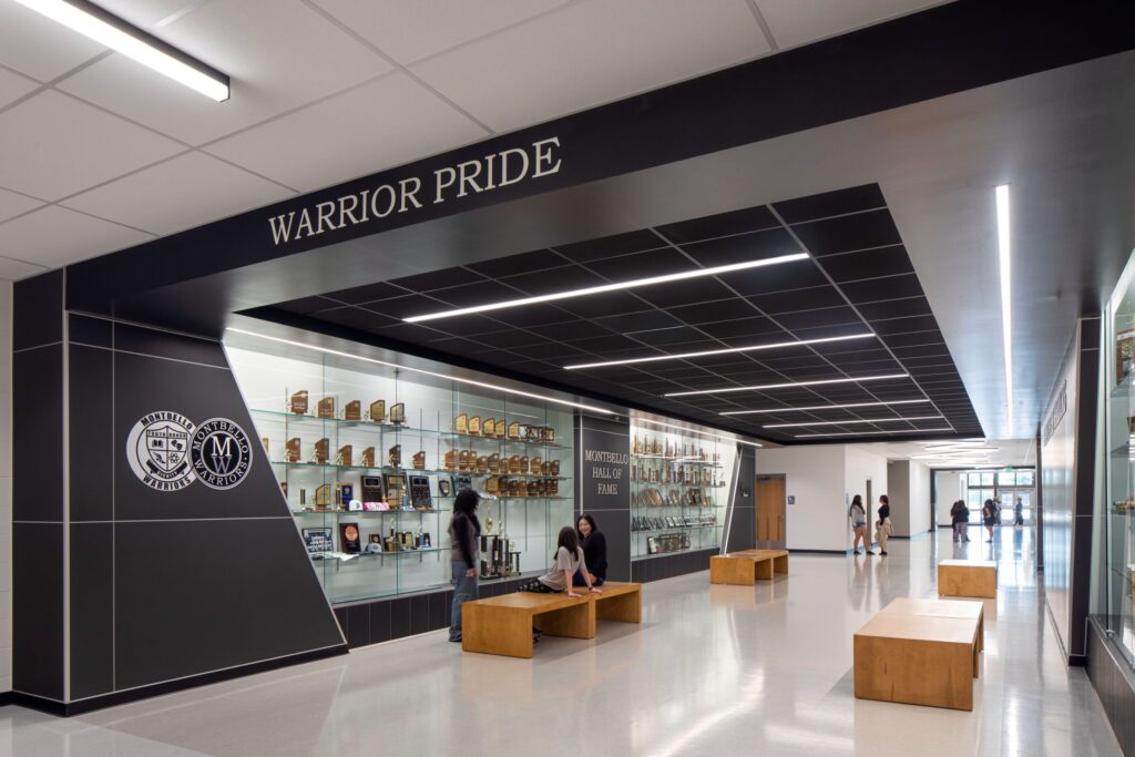 One of the most impactful contributions from ISEC was the PSI wall paneling, a prominent design feature integrated throughout the entire school. In addition, ISEC provided essential millwork and specialized casework, including classroom casework and countertops, music casework, glass display cases, fume hoods, and laboratory casework and countertops.