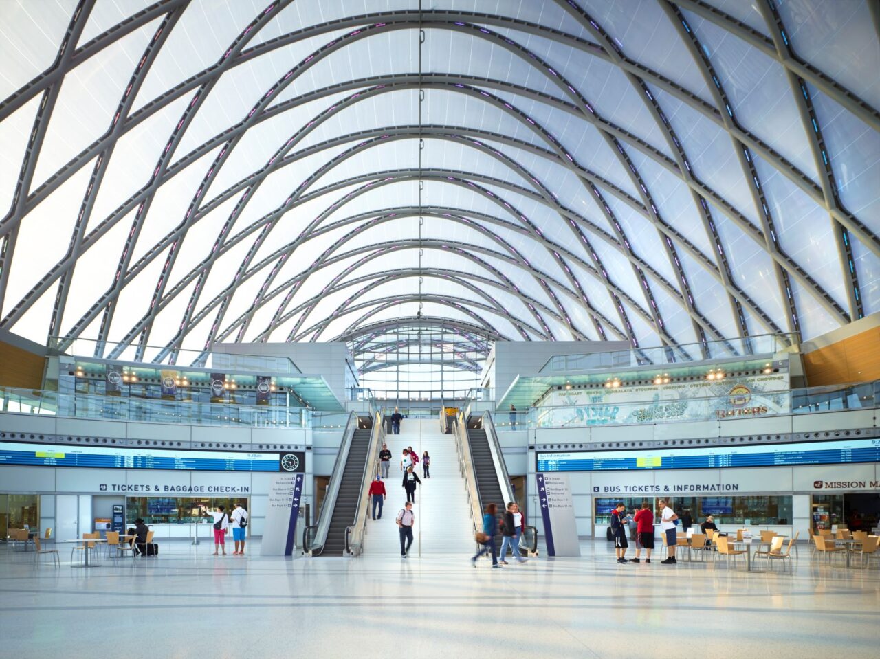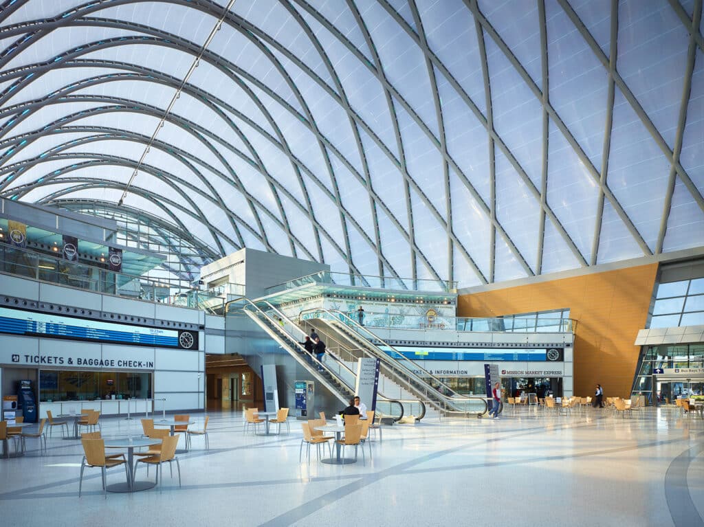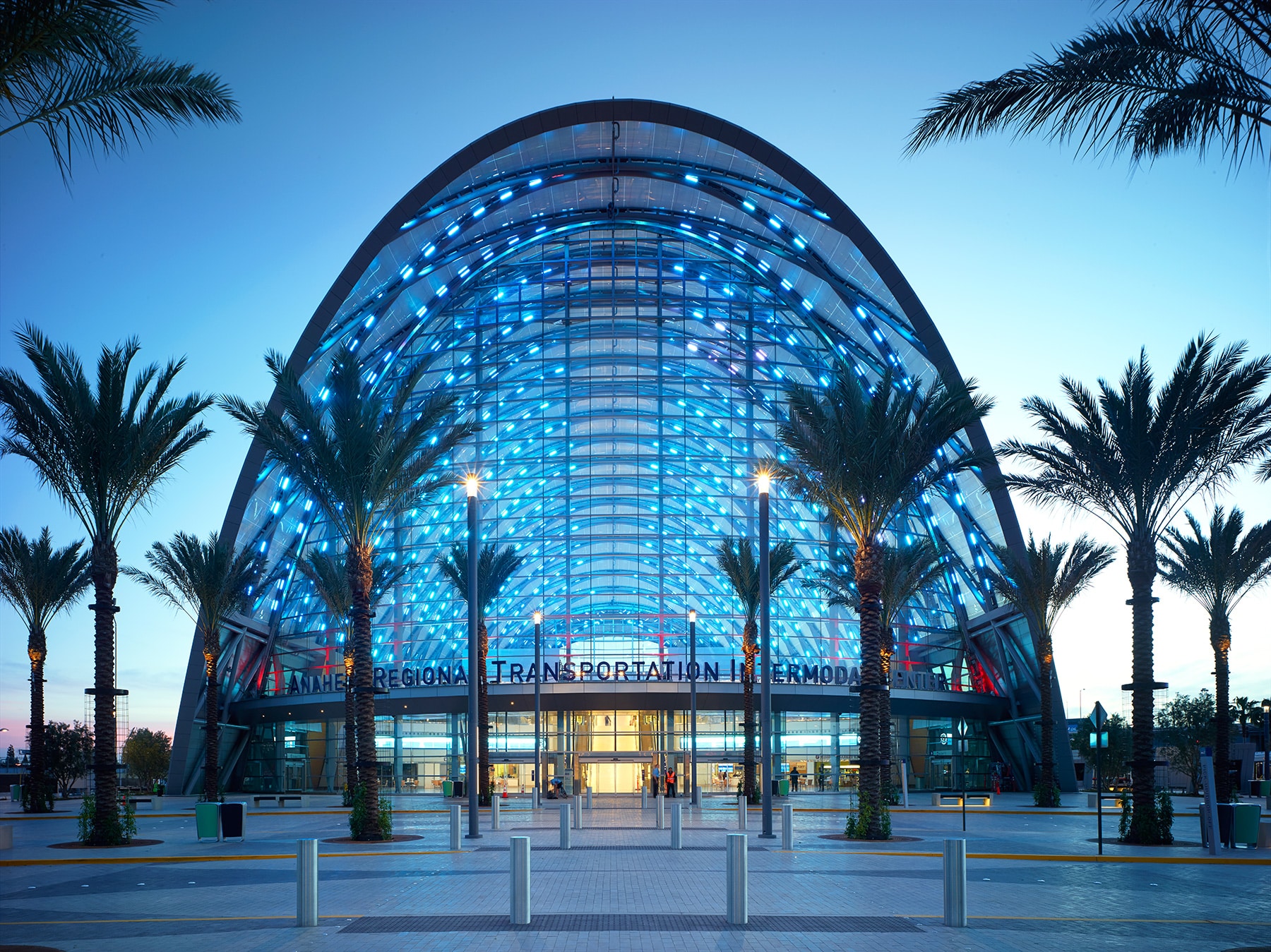 The Anaheim Regional Transportation Intermodal Center (ARTIC) provides Southern California with a flexible, futuristic terminal for rail, bus, auto passengers, bicyclists, and pedestrians. The illustrative design concept of diamond-shaped steel arches infilled with translucent ETFE (ethylene tetrafluoroethylene) creates a grand, light-filled atrium reminiscent of the world’s great passenger terminals of the early-20th century.