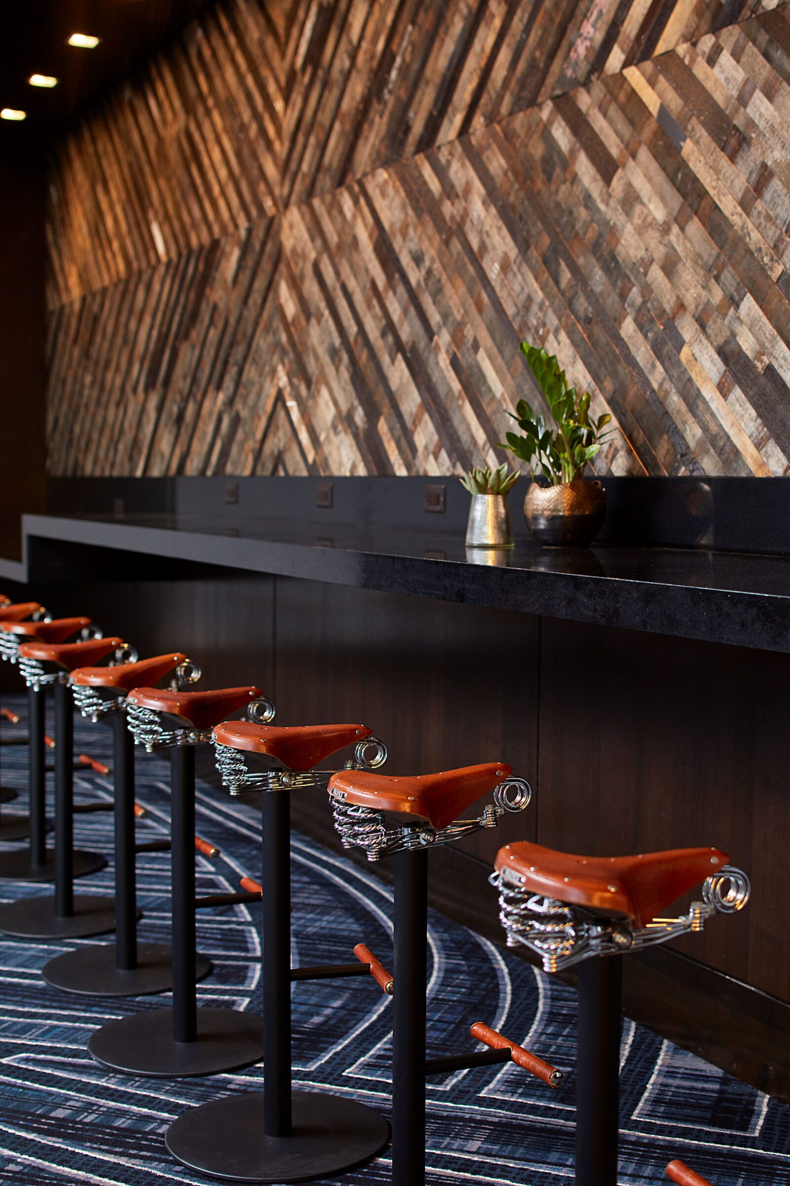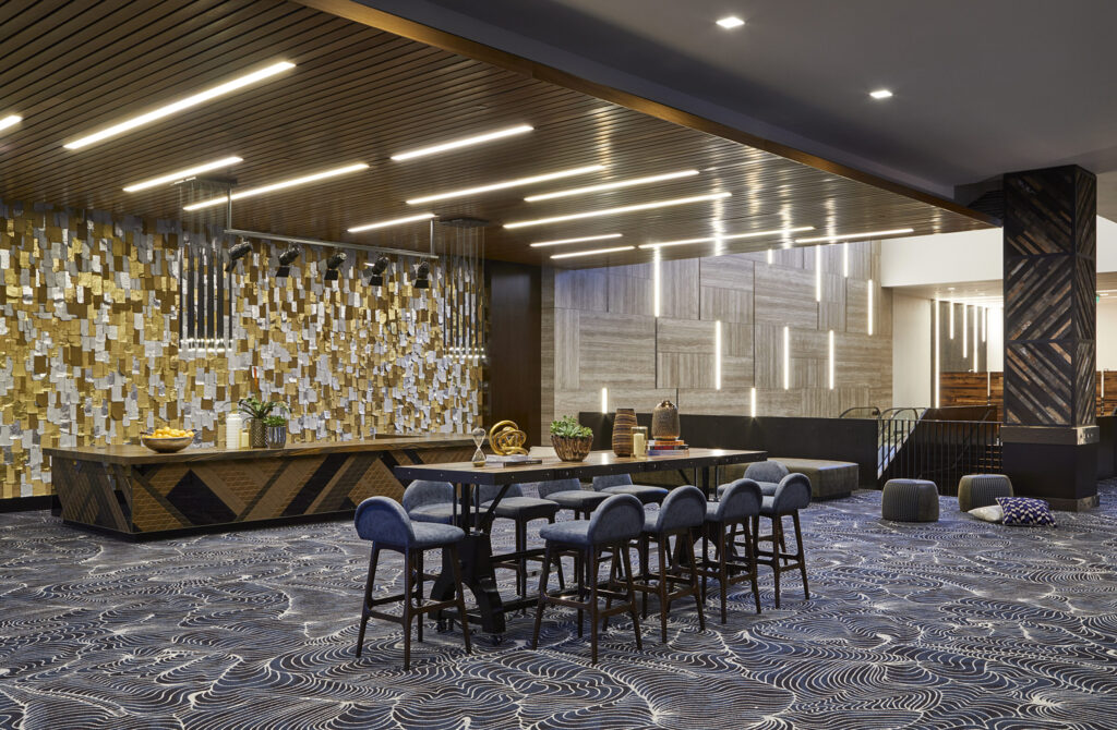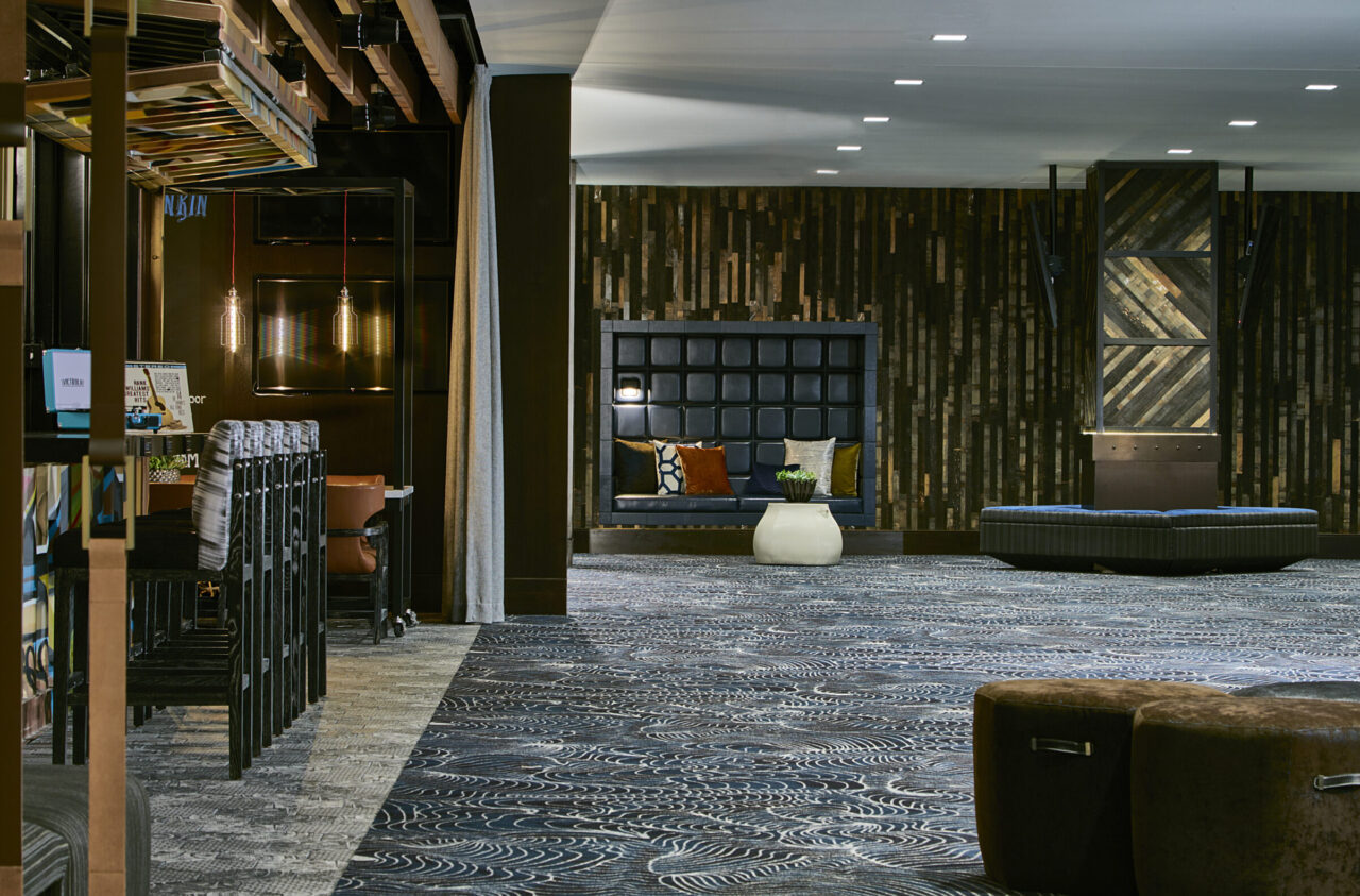 The scope included custom wood paneling, wood doors, casework, stone countertops, and intricate trim. One of the most technically demanding aspects of the project was aligning the wood portal paneling reveals with 10-foot wood doors, which featured grooved reveals built directly into the door faces. Careful coordination and precision installation were essential to achieve the clean, continuous lines required by the design. The finished space offers a refined, cohesive look that supports a variety of hospitality and event functions.