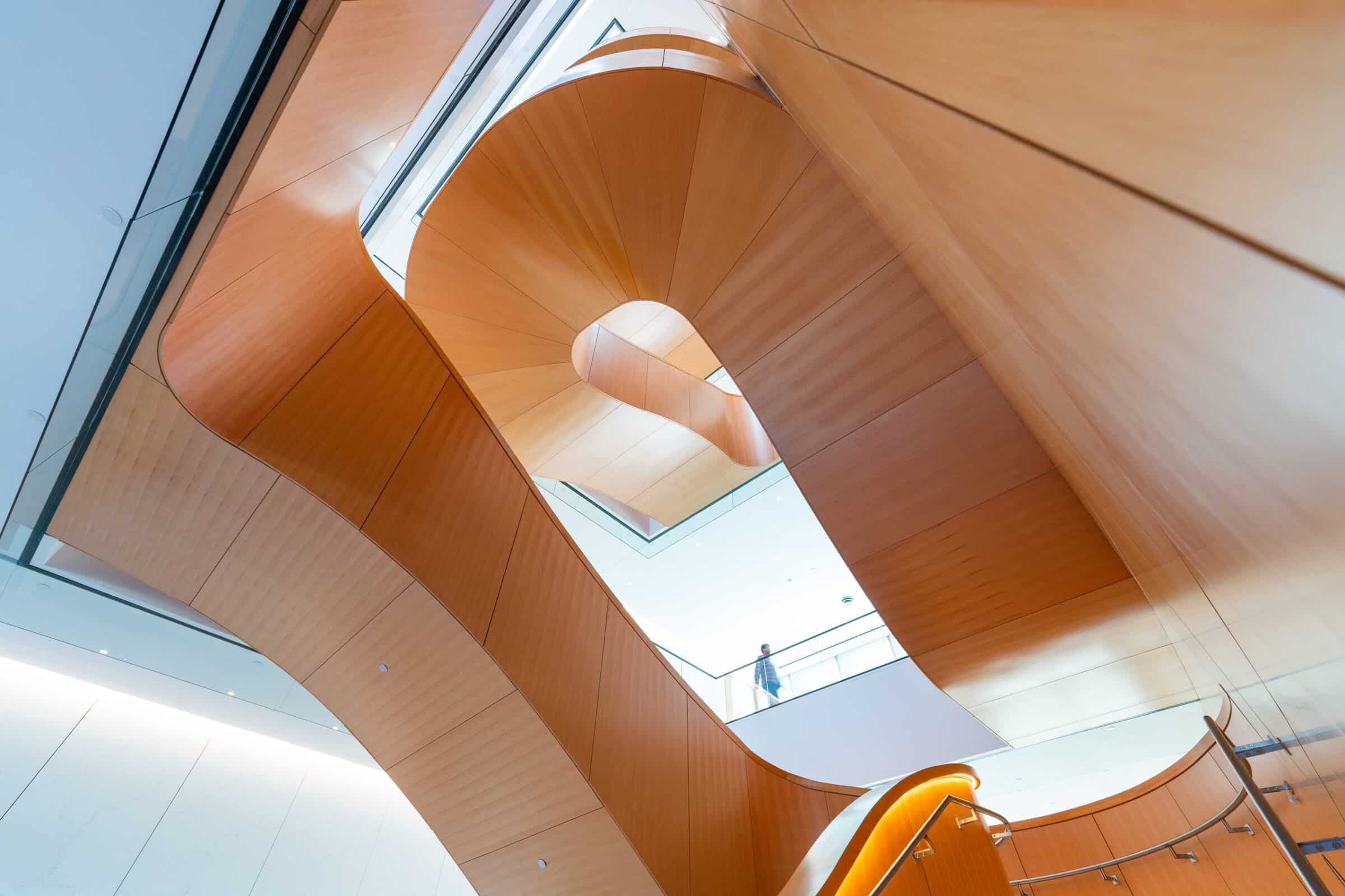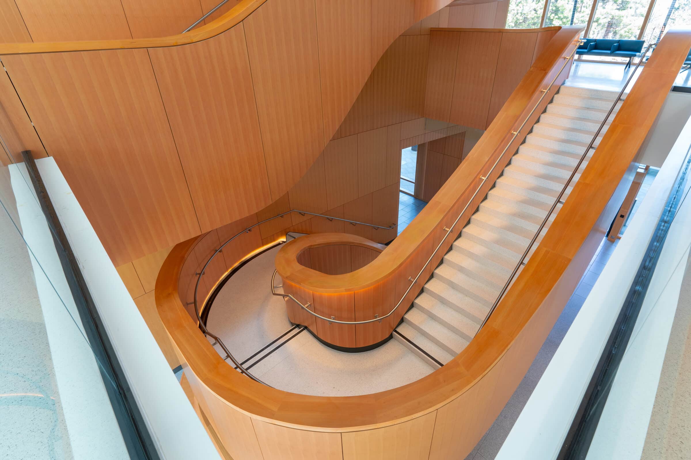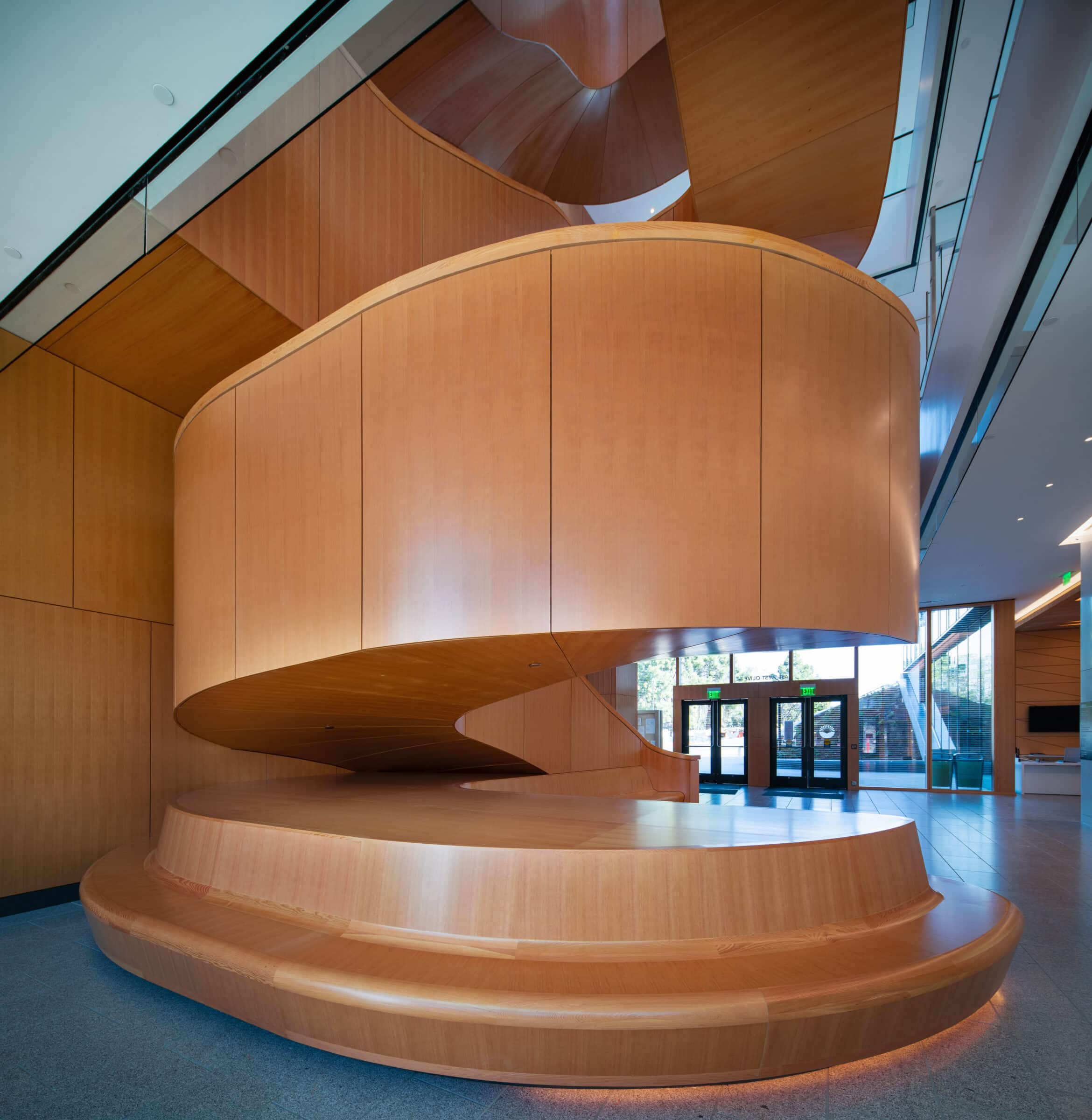 To achieve a seamless fit, each panel had to be hand-shaped, and the frame had to be 3D scanned to ensure every unique panel fit perfectly. The staircase stands over four stories tall and took over 5,000 carpenter hours to install.