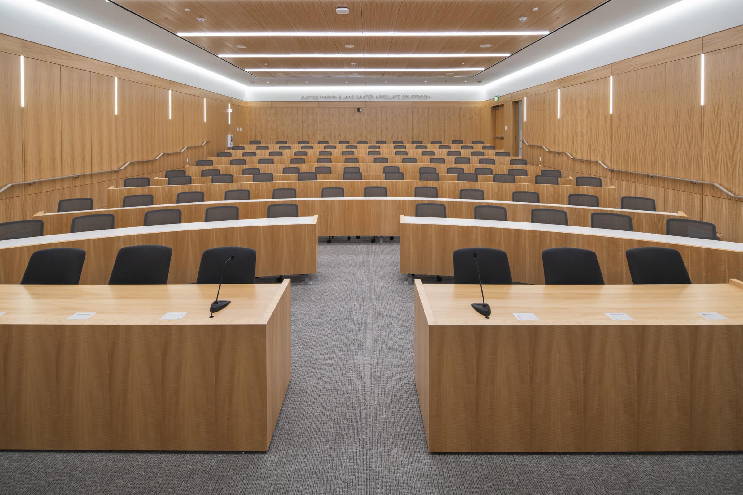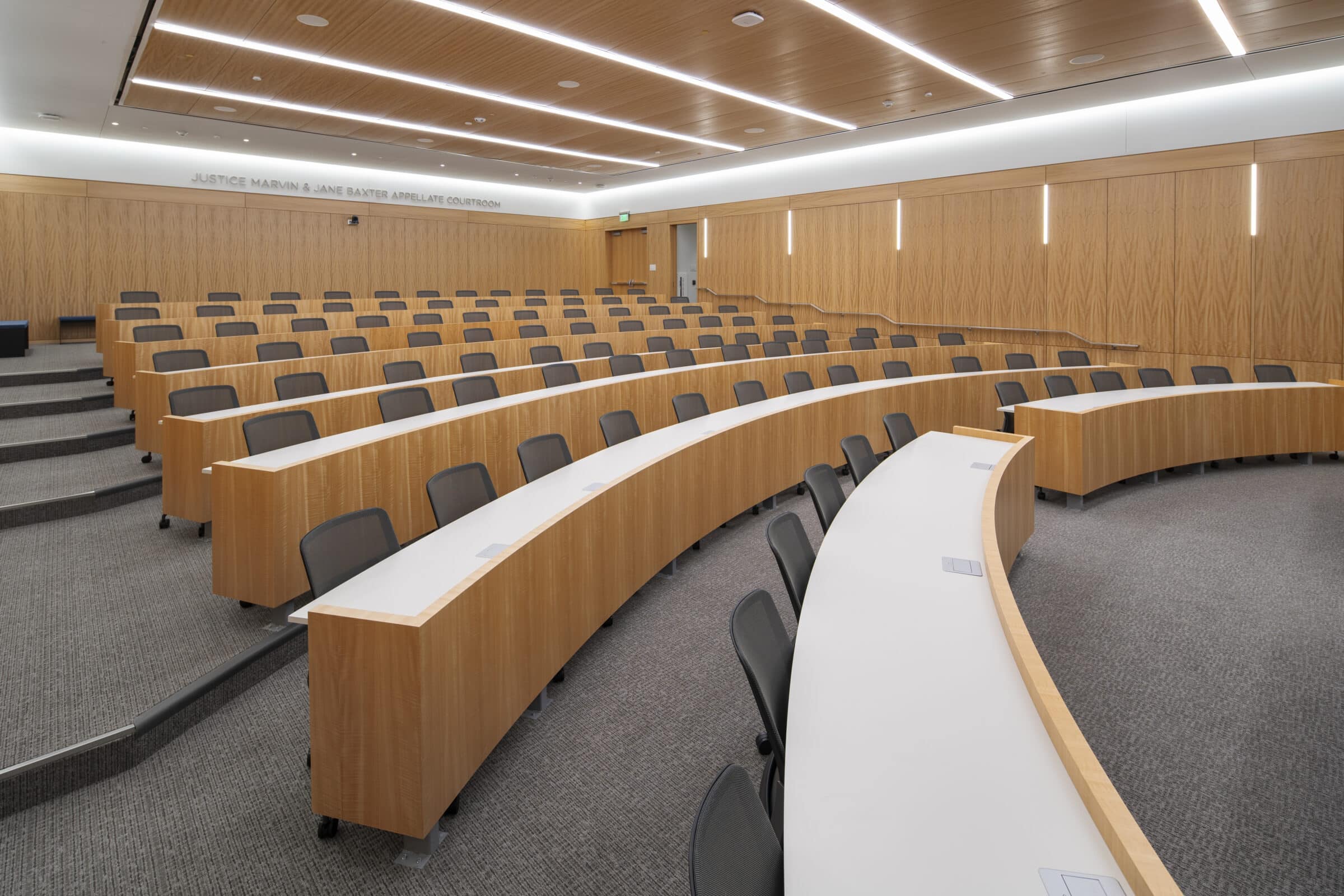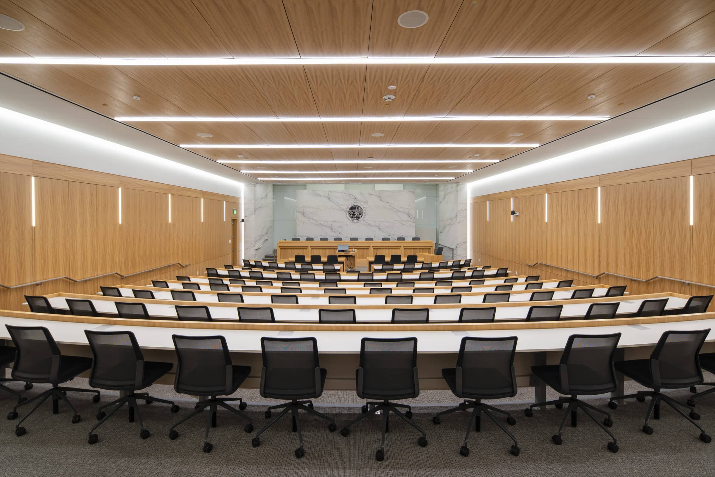 ISEC’s main work was concentrated in the mock trial rooms where we meticulously crafted wood ceilings, tables, and seamlessly integrated acoustic panels for superior sound quality. Utilizing our extensive network of manufacturing partners, we transformed multiple logs from the same tree into stunning wood veneers, both stained and unstained, ensuring consistency throughout. From the precision of the mock courtroom’s radius vector tables to precisely matched wall paneling, our commitment to excellence shines through in every detail. The result is a visually captivating masterpiece.