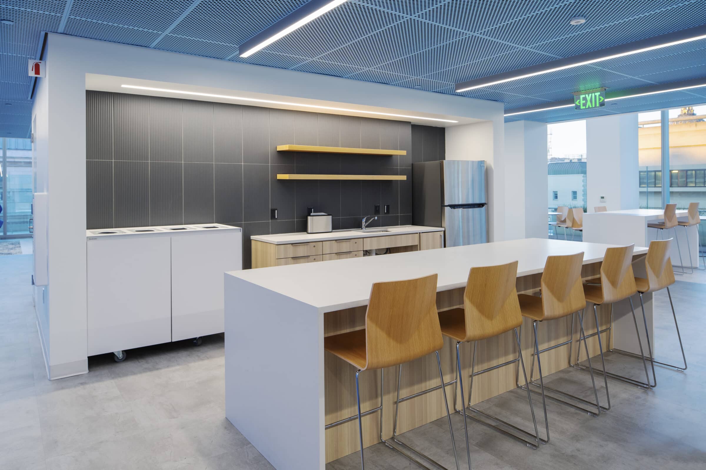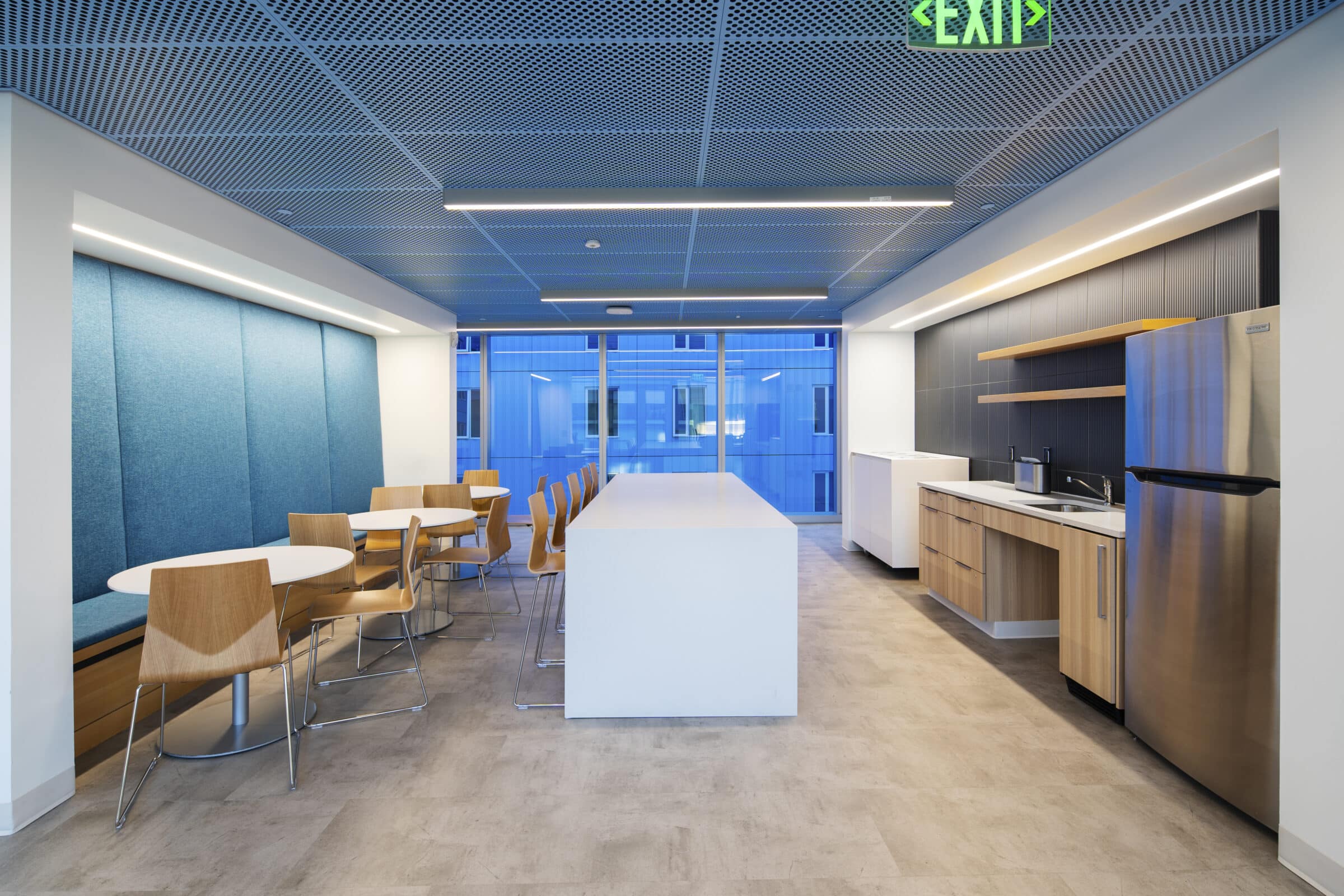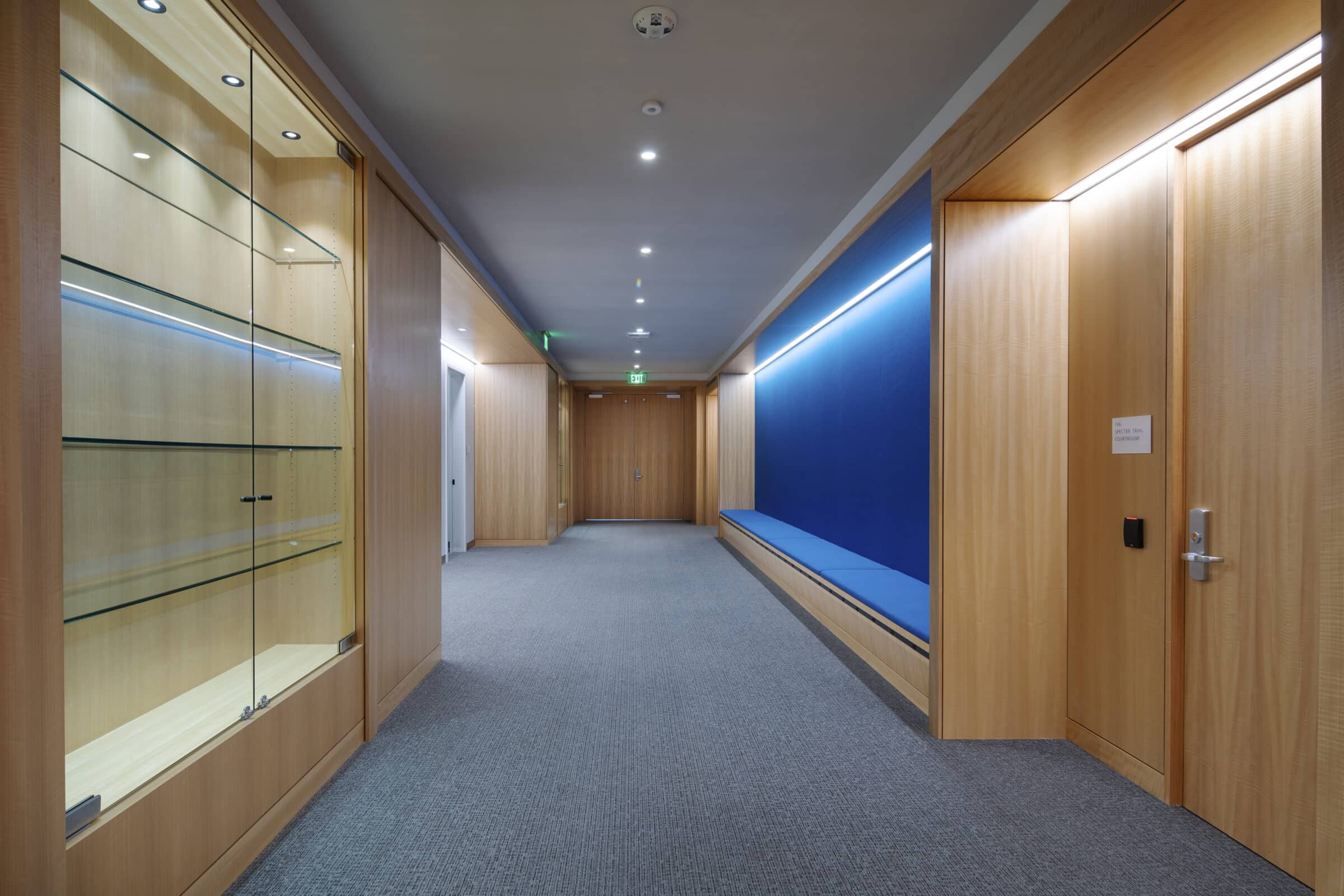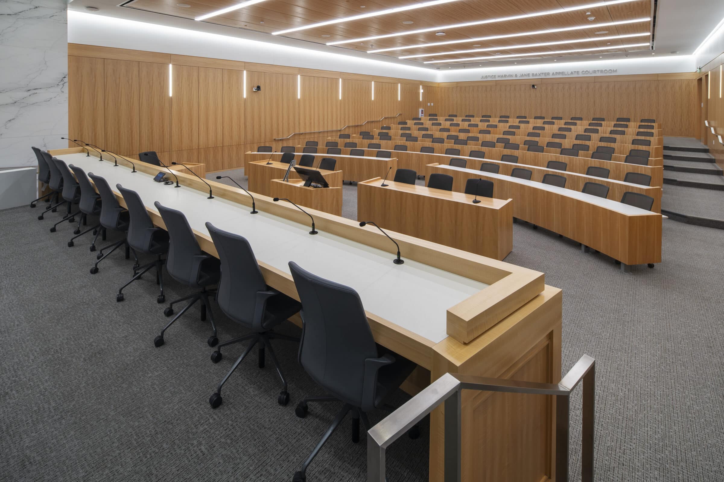 ISEC’s main work was concentrated in the mock trial rooms where we meticulously crafted wood ceilings, tables, and seamlessly integrated acoustic panels for superior sound quality. Utilizing our extensive network of manufacturing partners, we transformed multiple logs from the same tree into stunning wood veneers, both stained and unstained, ensuring consistency throughout. From the precision of the mock courtroom’s radius vector tables to precisely matched wall paneling, our commitment to excellence shines through in every detail. The result is a visually captivating masterpiece.