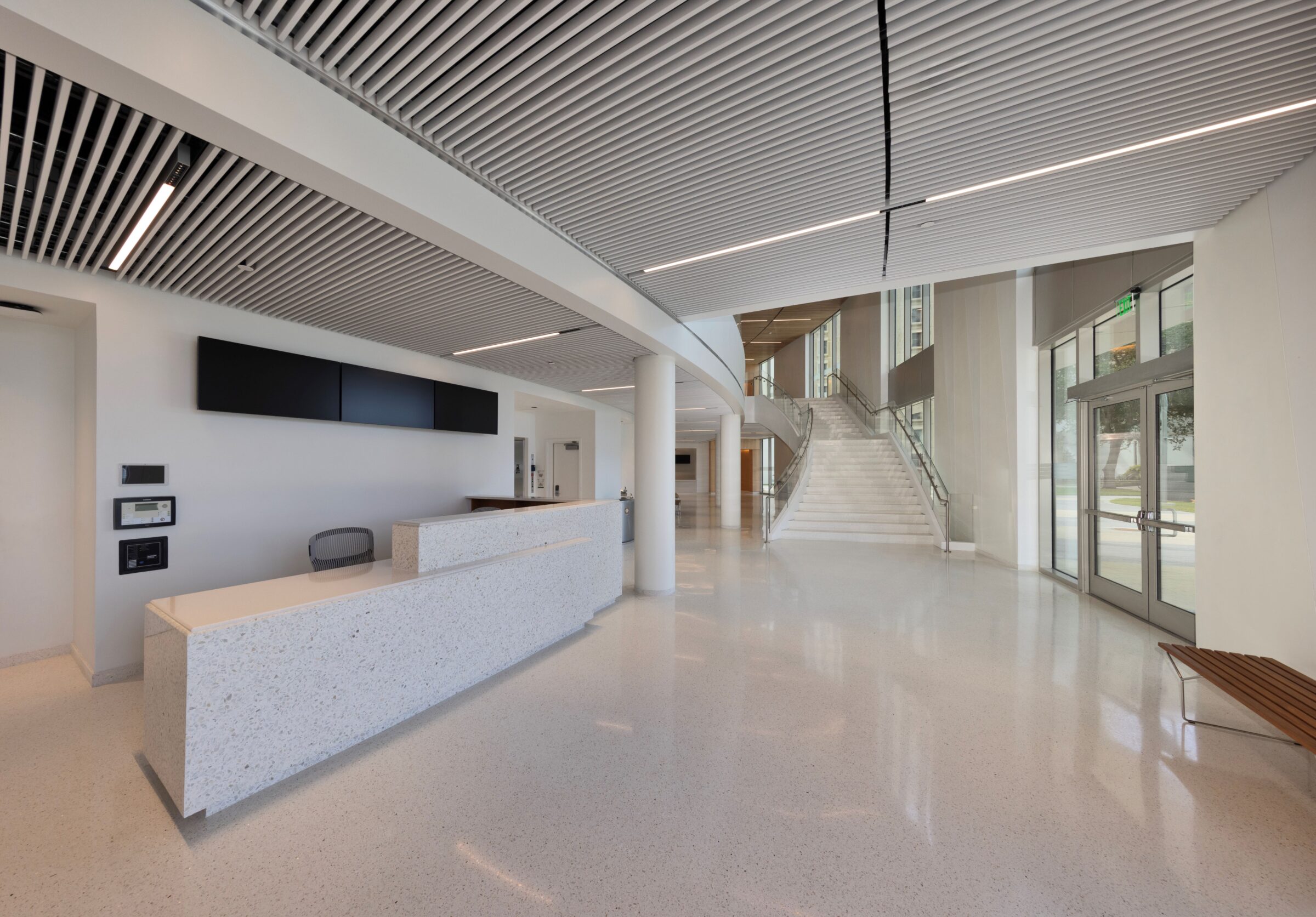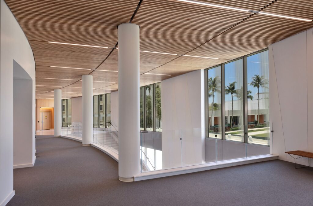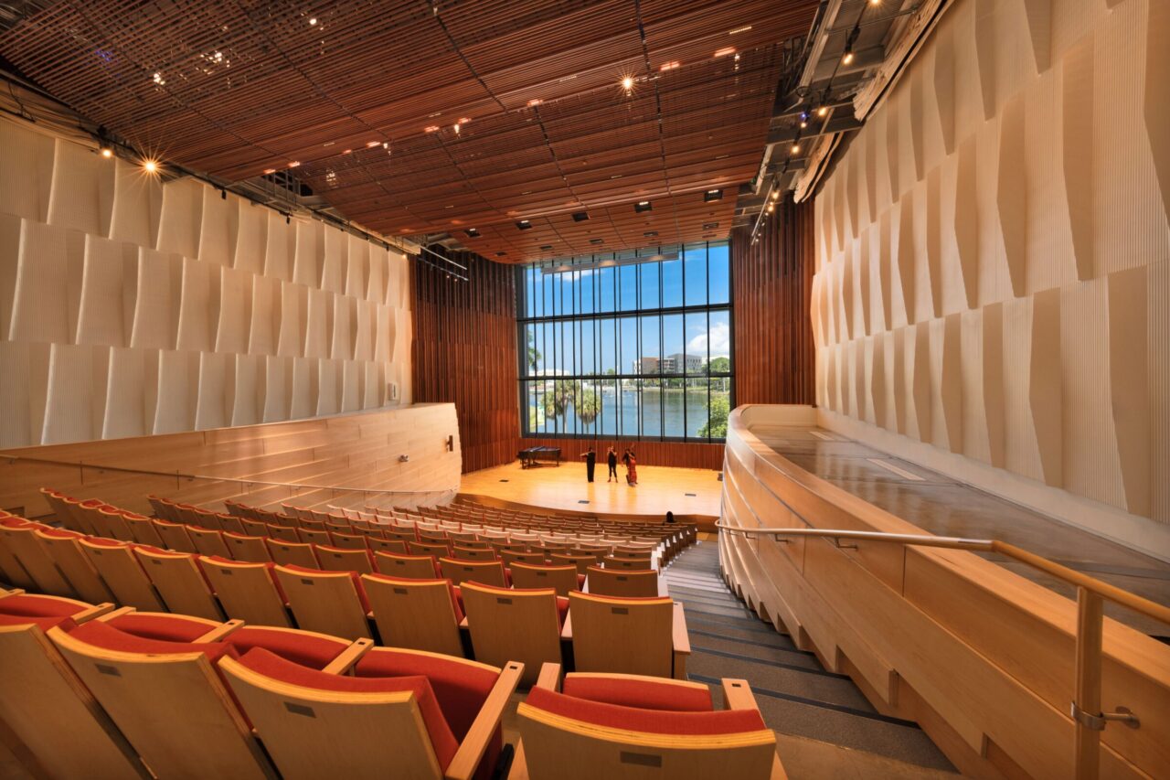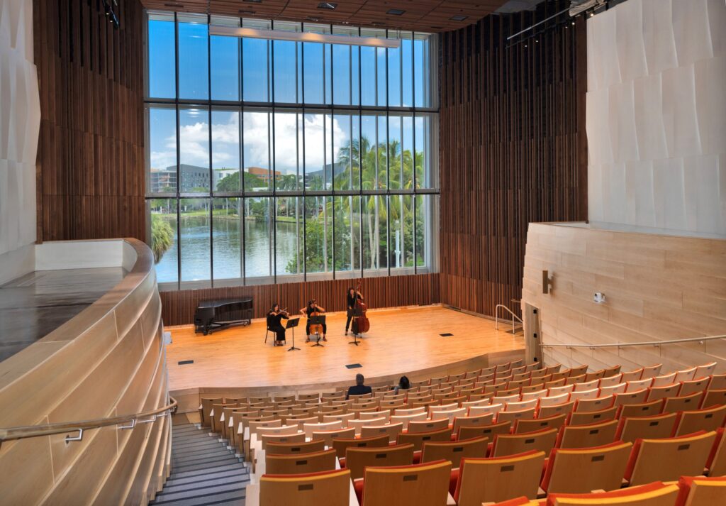 ISEC provided interior and specialty construction services for the Newman Recital Hall, a 200-seat performance space at the Frost School of Music at the University of Miami. Our scope included custom wood wall and ceiling panels designed to enhance the hall’s acoustic quality. We also installed movable acoustic panels surrounding the stage to allow for adaptable sound control. The space features cream-toned walls, natural wood finishes, and a large rear-stage window with views of Lake Osceola and the surrounding campus.