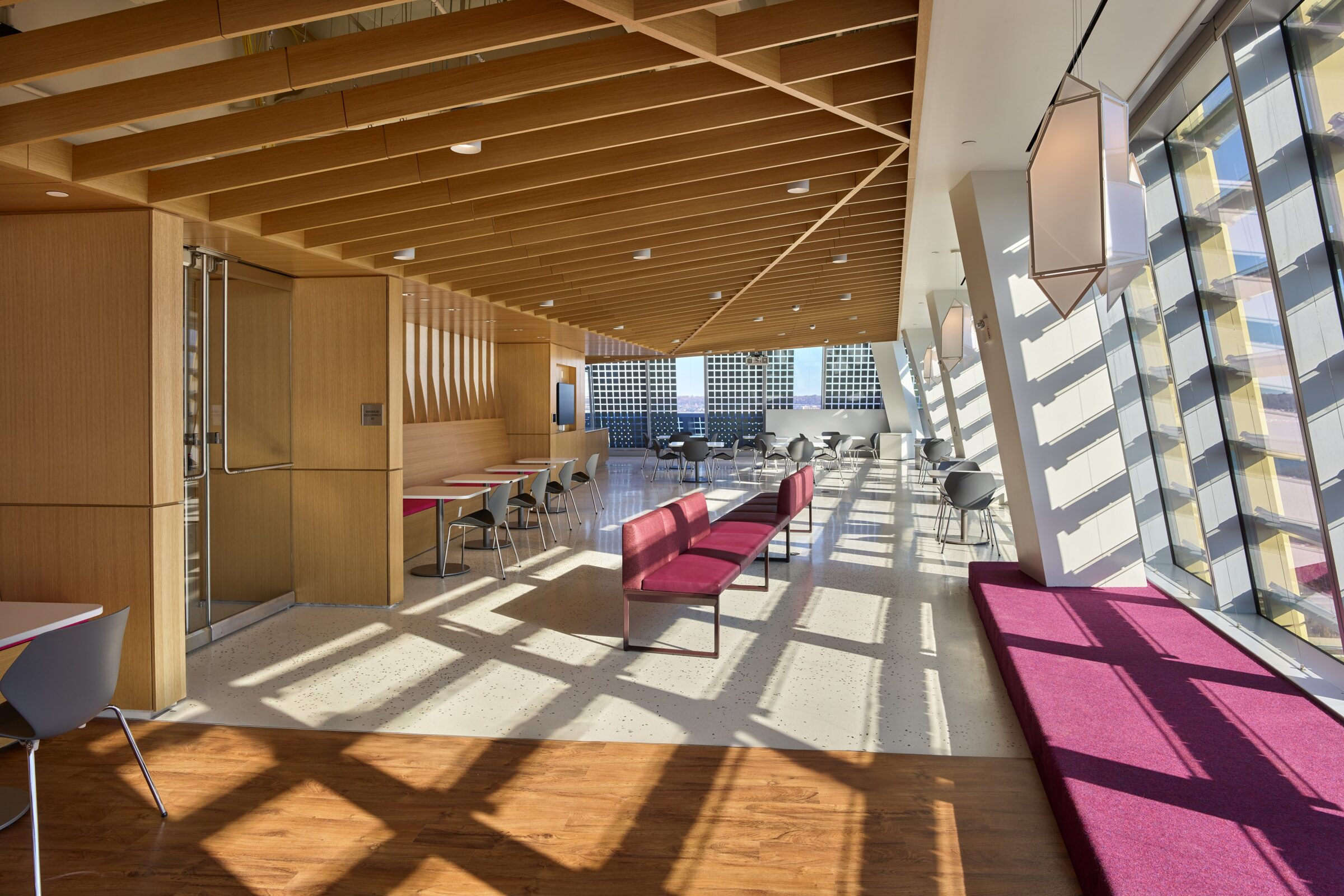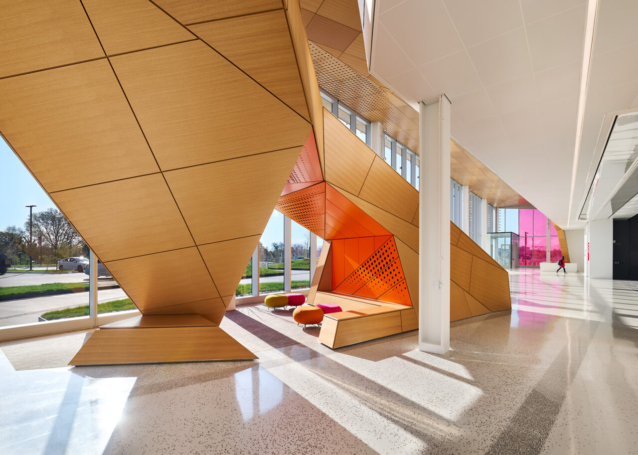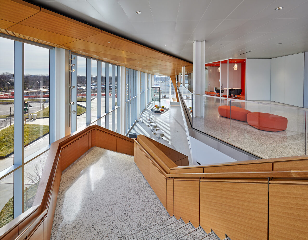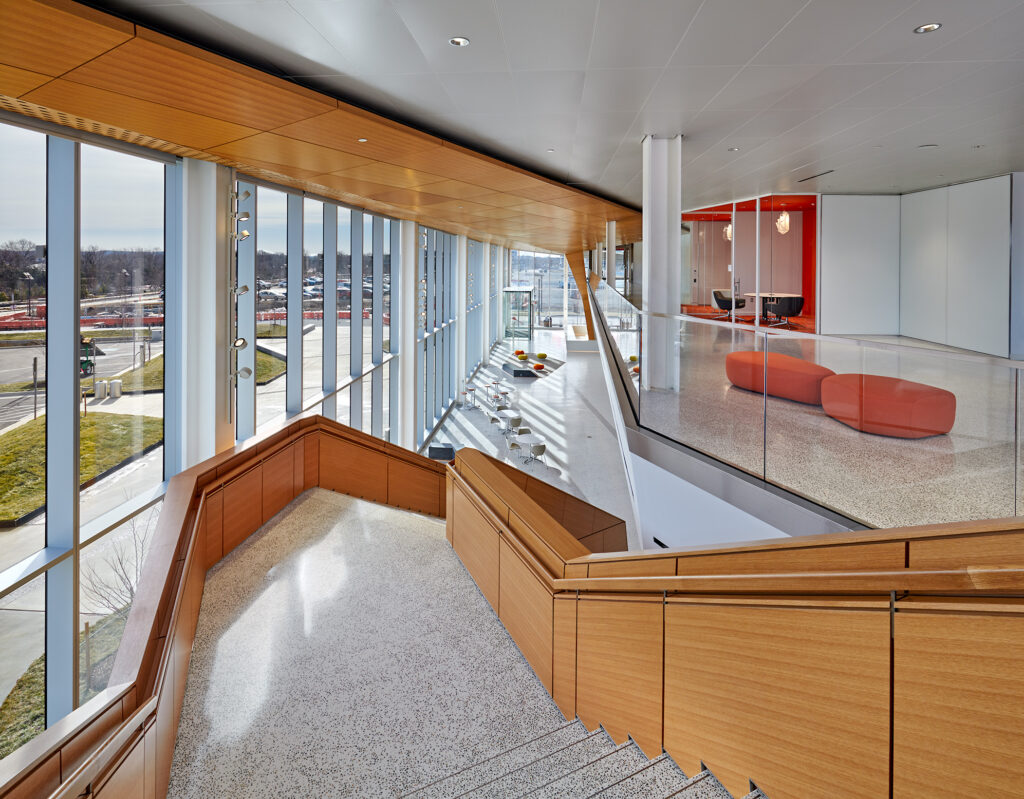The Virginia Tech Innovation Building showcased one of ISEC’s most complex millwork deliveries, with a 3,000 square foot monumental stair complemented by a 7,500 square foot acoustical ceiling and feature wall. Additional scope included quartz vanity tops, extensive millwork for the “Treehouse” area, acoustical panels and die-walls for meditation spaces, benches and upholstery, and numerous Corian-clad desks throughout the building.
